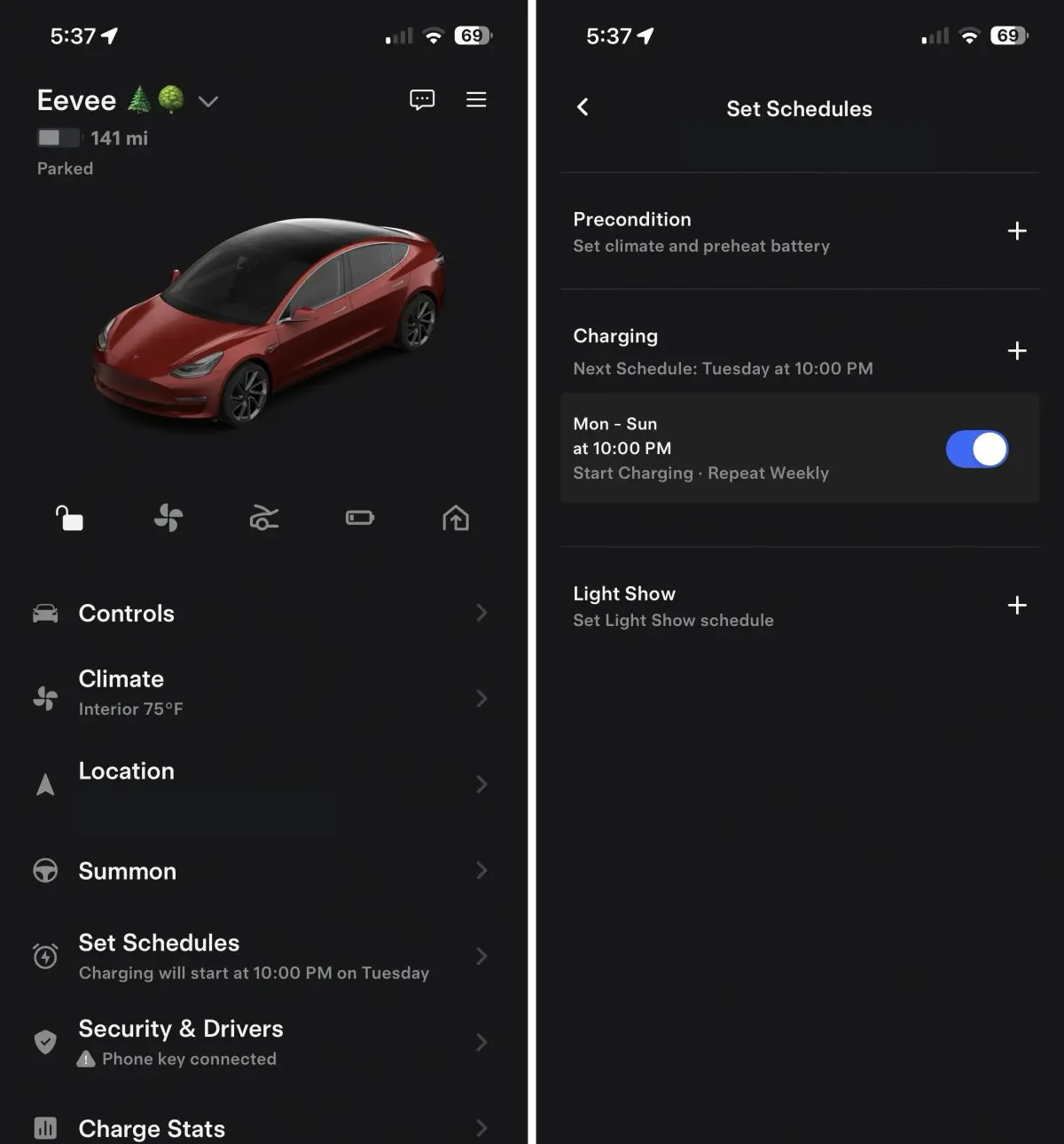 Tesla ได้ปรับปรุงส่วน Schedules ในแอป โดยเปลี่ยนชื่อเป็น Set Schedules เพื่อให้ผู้ใช้เข้าใจการใช้งานได้ชัดเจนยิ่งขึ้น