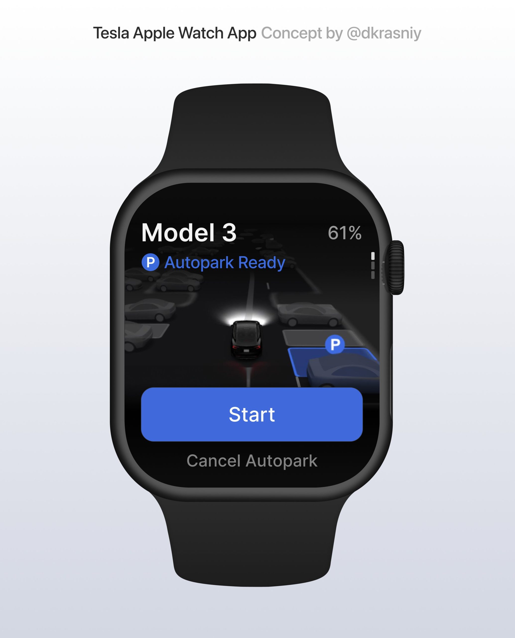 พาชมภาพแนวคิดแอป Tesla บน Apple Watch แสดงการควบคุมรถ ควบคุมระบบขับขี่อัตโนมัติ และจอดอัตโนมัติง่าย ๆ บนข้อมือ