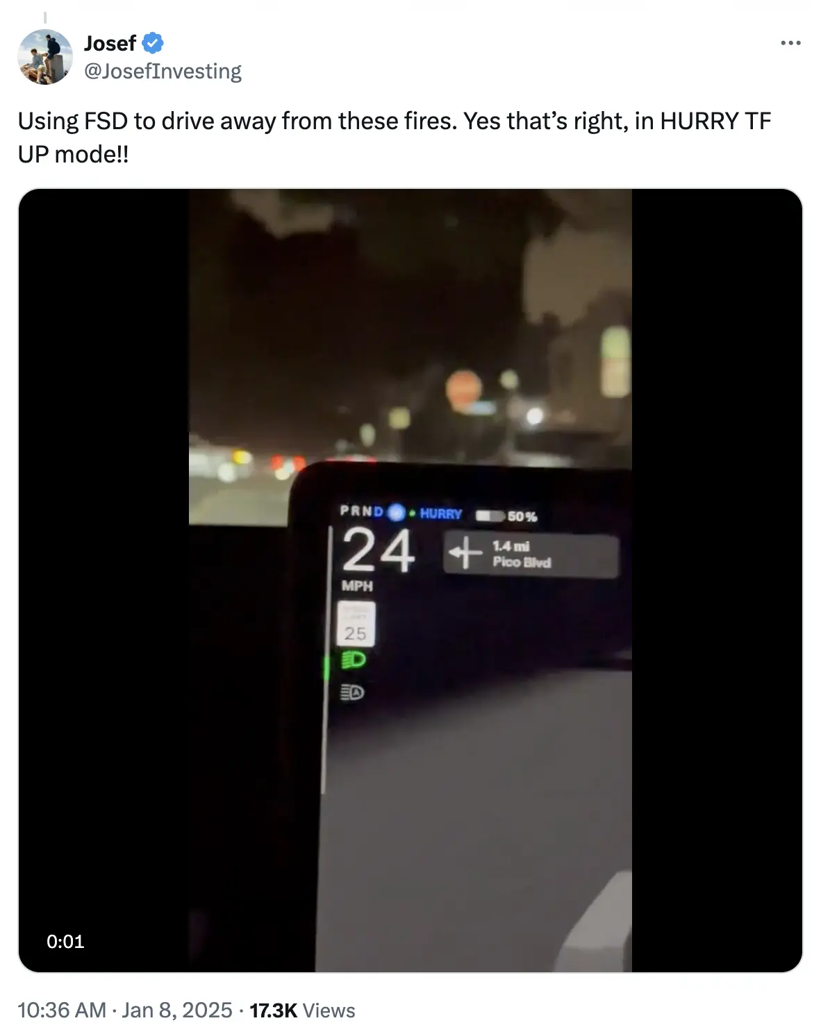 อีกหนึ่งโพสต์ของ JosefInvesting ระบุว่า เขาใช้โหมด Hurry ในฟีเจอร์ Full Self-Driving เพื่อหนีไฟป่าได้อย่างรวดเร็วปลอดภัย โหมดนี้จะช่วยเปลี่ยนเลนและแซงรถในเส้นทางจราจรในเมือง แต่น่าเสียดายที่อพาร์ทเมนต์ของเขาถูกไฟไหม้