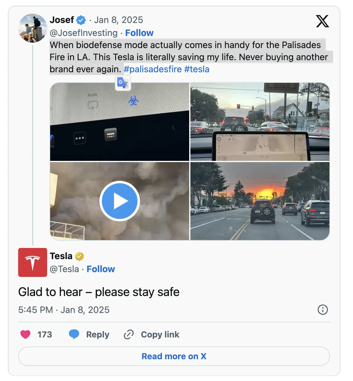 ข้อมูลจากผู้ใช้ Tesla ในพื้นที่ดังกล่าวเผยว่า โหมดป้องกันอาวุธชีวภาพในรถ Tesla มีประโยชน์มากระหว่างที่ขับขี่ในช่วงที่เกิดไฟไหม้รุนแรงนี้