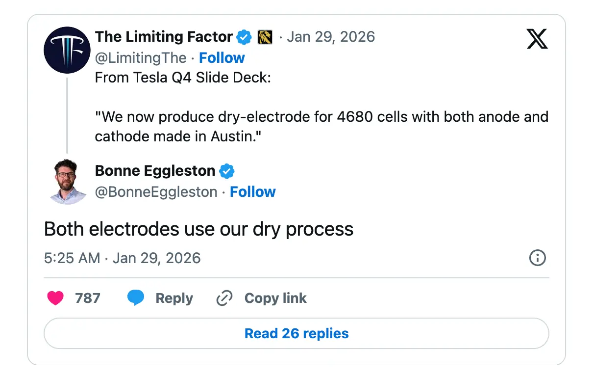 ข้อมูลนี้ถูกเปิดเผยในรายงานสรุปผลประกอบการไตรมาสที่ 4 และปีงบประมาณ 2025 ของ Tesla ซึ่งระบุว่าบริษัทได้ก้าวข้ามหนึ่งในความท้าทายที่ยากที่สุดของการผลิตเซลล์แบตเตอรี่รุ่นใหม่นี้ โดย Bonne Eggleston รองประธานฝ่ายแบตเตอรี่ 4680 ของ Tesla ได้เน้นย้ำเรื่องนี้ผ่านแพลตฟอร์ม X ว่า “ขั้วไฟฟ้าทั้งสองฝั่งผลิตด้วยกระบวนการแบบแห้งของเราเอง”