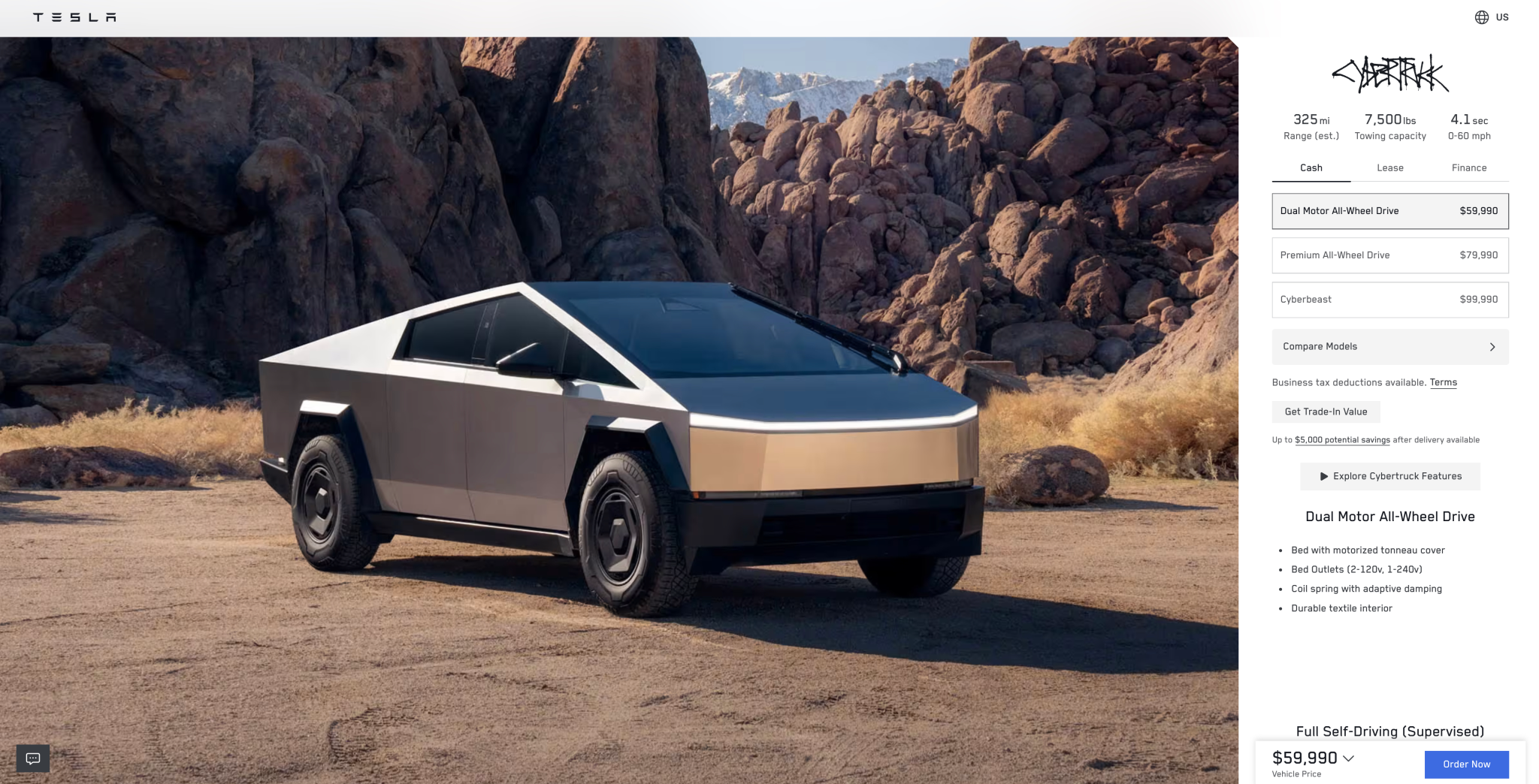 ปัจจุบัน Tesla เริ่มวางจำหน่าย Cybertruck รุ่นพื้นฐานแบบขับเคลื่อนสี่ล้อ (All-Wheel Drive หรือ AWD) ในราคาเริ่มต้นที่ 60,000 ดอลลาร์ (ประมาณ 1,872,000 บาท) พร้อมกันนี้ยังได้ปรับลดราคารุ่นท็อปอย่าง Cyberbeast ลงเหลือ 100,000 ดอลลาร์ (ประมาณ 3,120,000 บาท) จากเดิมที่เคยขายอยู่ 115,000 ดอลลาร์ (ประมาณ 3,588,000 บาท)