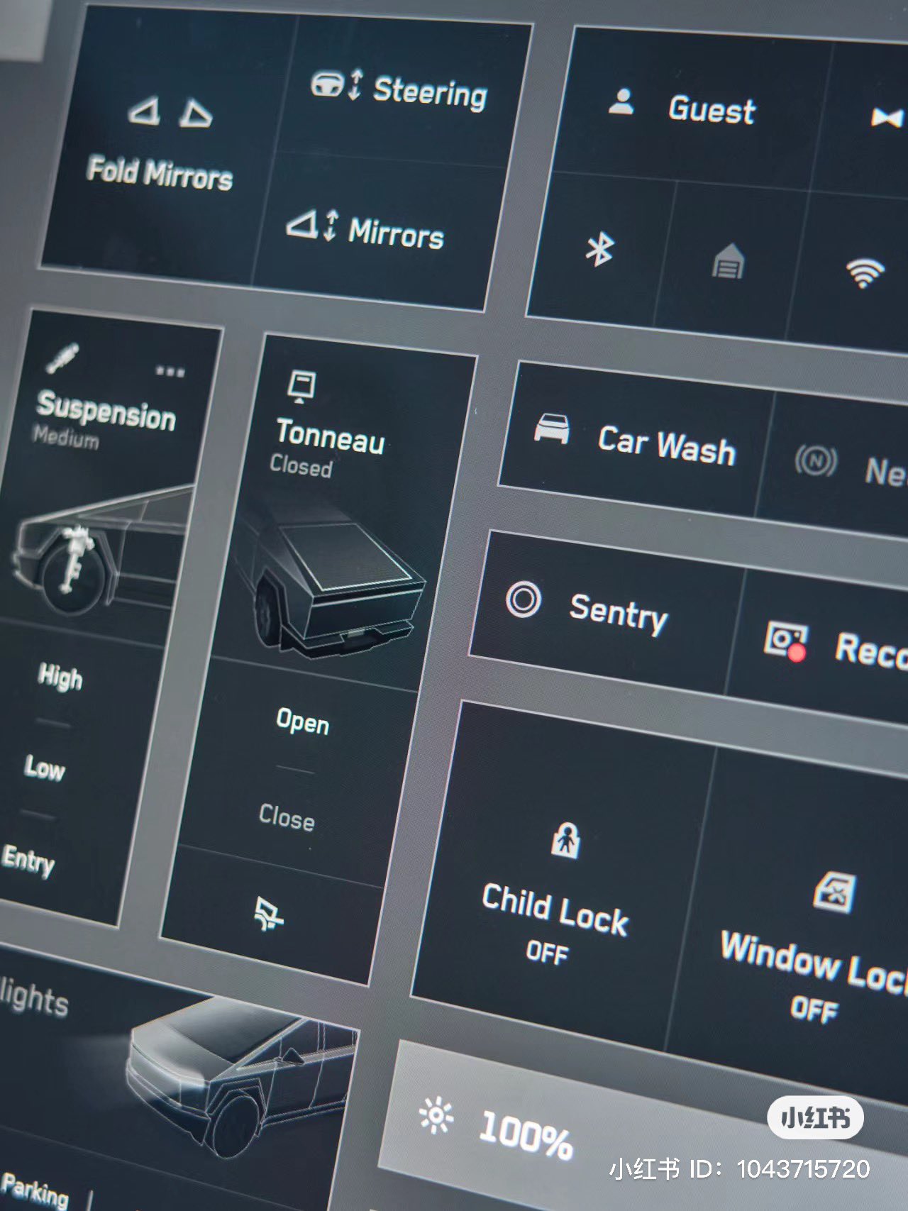 จากภาพ UI บนหน้าจอสัมผัส จะเห็นกันชัด ๆ คือ ปุ่มหน้าจอสัมผัสสำหรับการเลื่อนเปิด/ปิด ฝาคลุมกระบะท้ายและฝาท้าย และปุ่มหน้าจอสัมผัสสำหรับปรับช่วงล่าง มีทั้ง Entry, Low และ High นอกจากนี้ยังเห็นปุ่มหน้าจอสัมผัสการควบคุมอื่น ๆ อีกมากมาย รวมถึงการปรับกระจก, ปรับพวงมาลัย, โหมดล้างรถ (Car Wash), Sentry Mode และอื่น ๆ