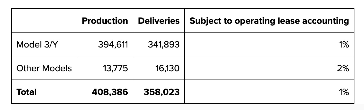 จากตารางข้อมูลระบุว่า Model 3 และ Model Y ผลิตได้ 394,611 คัน และส่งมอบได้ 341,893 คัน ส่วนรุ่นอื่นๆ (Other Models) ผลิตได้ 13,775 คัน และส่งมอบได้ 16,130 คัน รวมทั้งสิ้นผลิตได้ 408,386 คัน และส่งมอบได้ 358,023 คัน