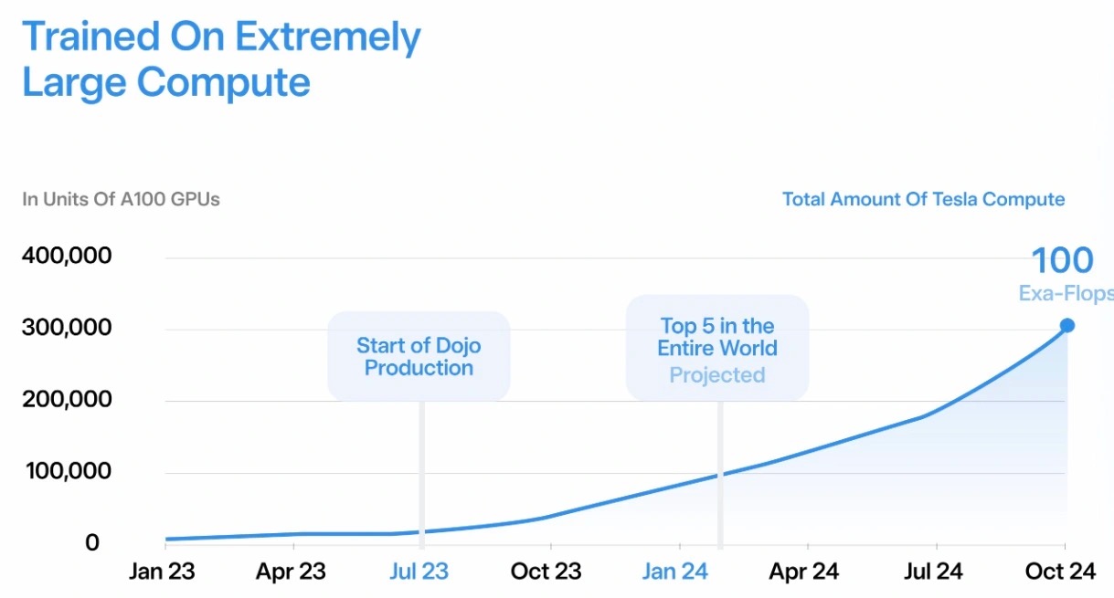 Tesla Dojo เป็นซูเปอร์คอมพิวเตอร์ปรับแต่งเองที่สร้างขึ้นโดย Tesla ใช้แพลตฟอร์ม AI Machine Learning ที่เรียนรู้และเทรนโมเดล AI ขั้นสูงด้วยข้อมูลวิดีโอที่มาจากรถยนต์จำนวนมาก แล้วเก็บข้อมูลสถานการณ์การขับขี่เป็นฐานข้อมูลขนาดใหญ่ Tesla คาดการณ์ว่า การประมวลผลของ Dojo จะอยู่อันดับต้น ๆ ของโลกราว ๆ เดือนมกราคม 2024 และในเดือนตุลาคม 2024 คาดว่าความเร็วในการประมวลผลจะทะลุไปถึง 100 Exaflops