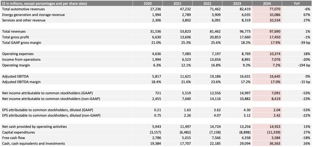 ส่วนของกำไรขั้นต้นลดลง 6% เมื่อเทียบรายปีในไตรมาสที่ 4 และทั้งปี 2024 กำไรต่อหุ้นของ Tesla ลดลงถึง 22% แต่บริษัทยังคงมีกำไรและเงินสดเพิ่มขึ้นเป็น 36.6 พันล้านดอลลาร์สหรัฐฯ