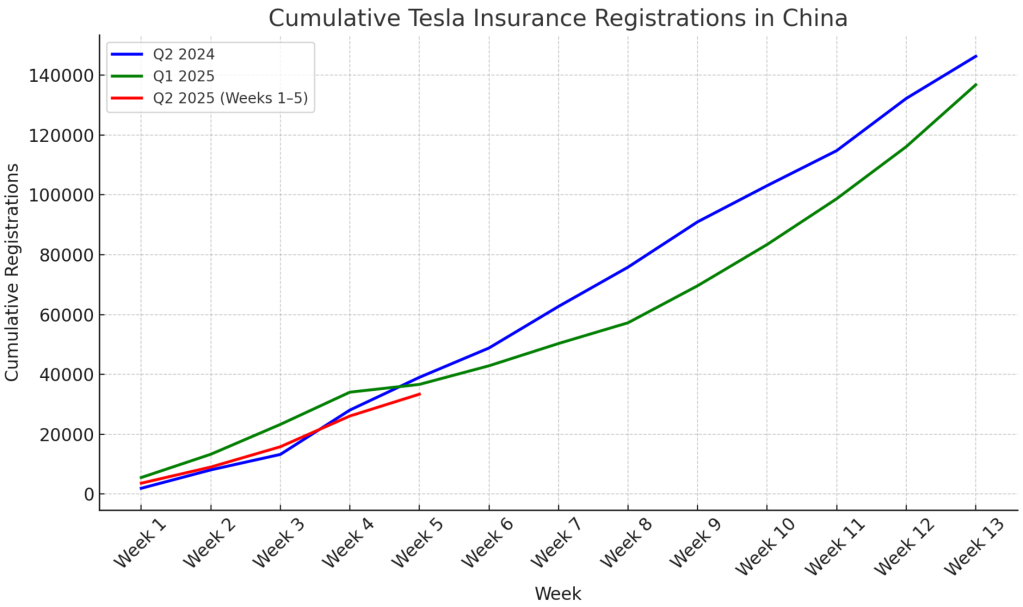 เมื่อดูจากข้อมูลการลงทะเบียนประกันภัยรถยนต์ในจีน ยังชี้ให้เห็นว่ายอดส่งมอบของ Tesla ในประเทศจีนในไตรมาสนี้ ลดลงเมื่อเทียบกับช่วงเวลาเดียวกันของปีที่แล้ว รวมถึงไตรมาสแรกของปี 2025 ด้วย