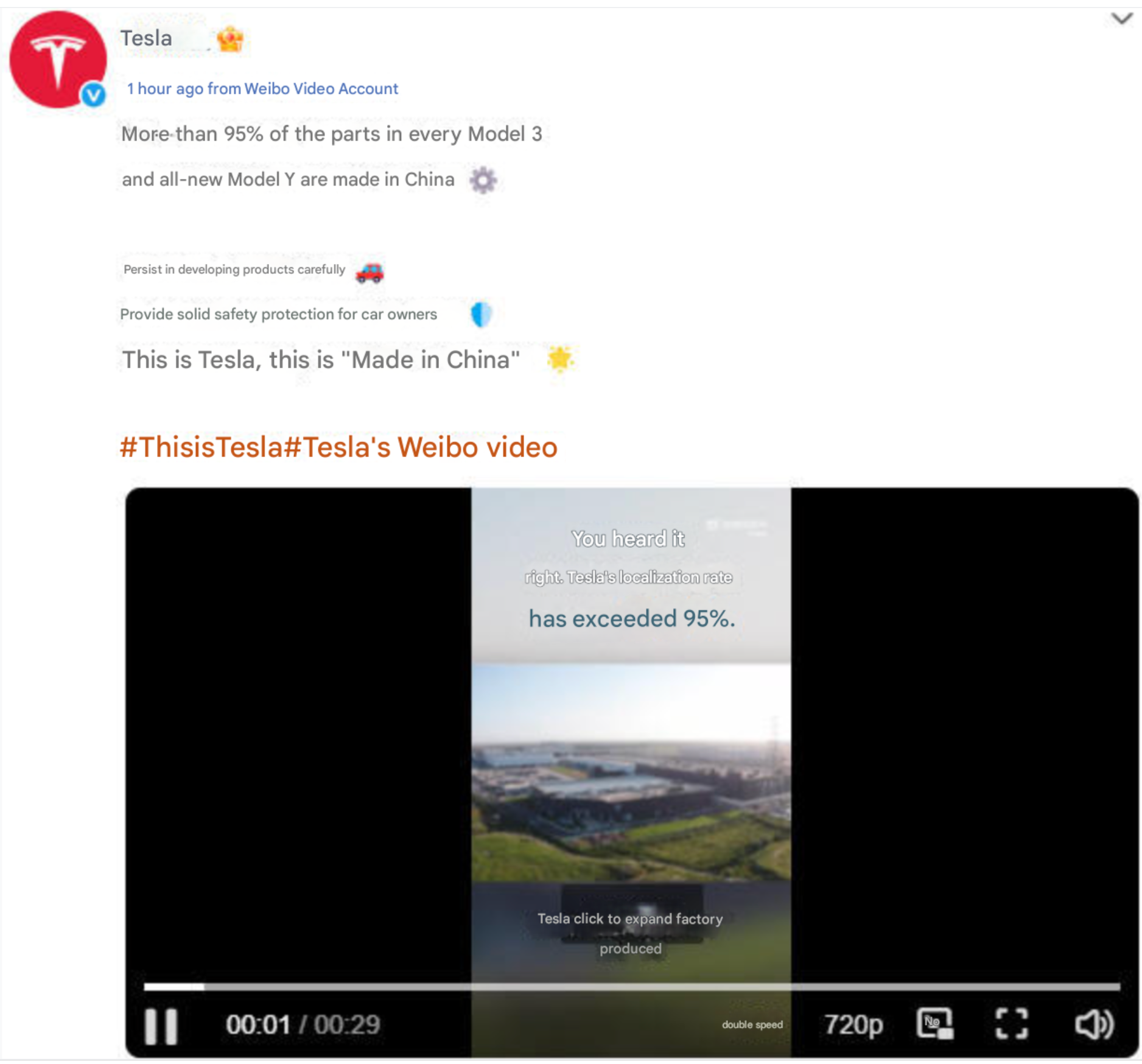 ในโพสต์ประชาสัมพันธ์ของบริษัท ได้มีข้อความว่า “This is Tesla, this is ‘Made in China’”
