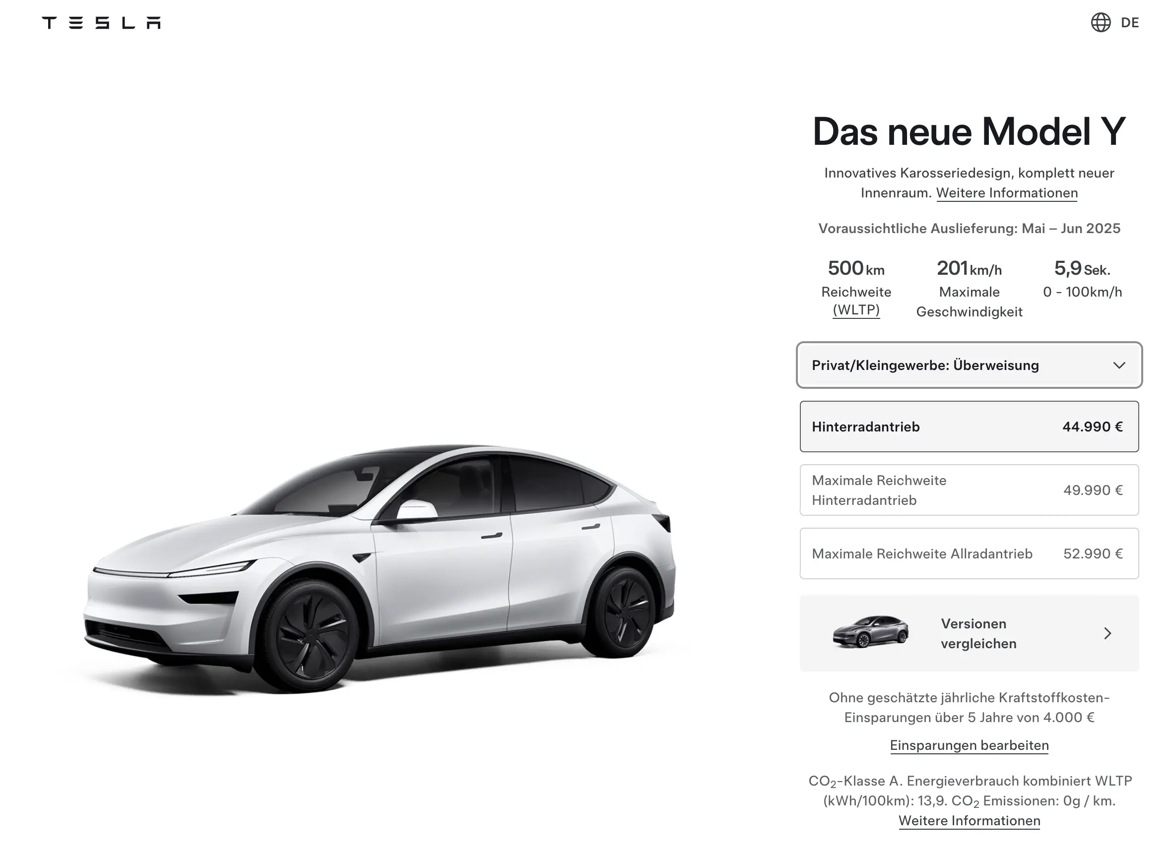 รุ่นเริ่มต้นเป็น Rear-Wheel Drive (RWD) ราคา €44,990 เป็นรุ่นที่ถูกที่สุดในไลน์อัป Model Y ใหม่ แต่มีระยะทางวิ่งที่สั้นที่สุดที่ 311 ไมล์ (WLTP) และไม่มีคุณสมบัติบางอย่างที่มีในรุ่นที่สูงกว่า