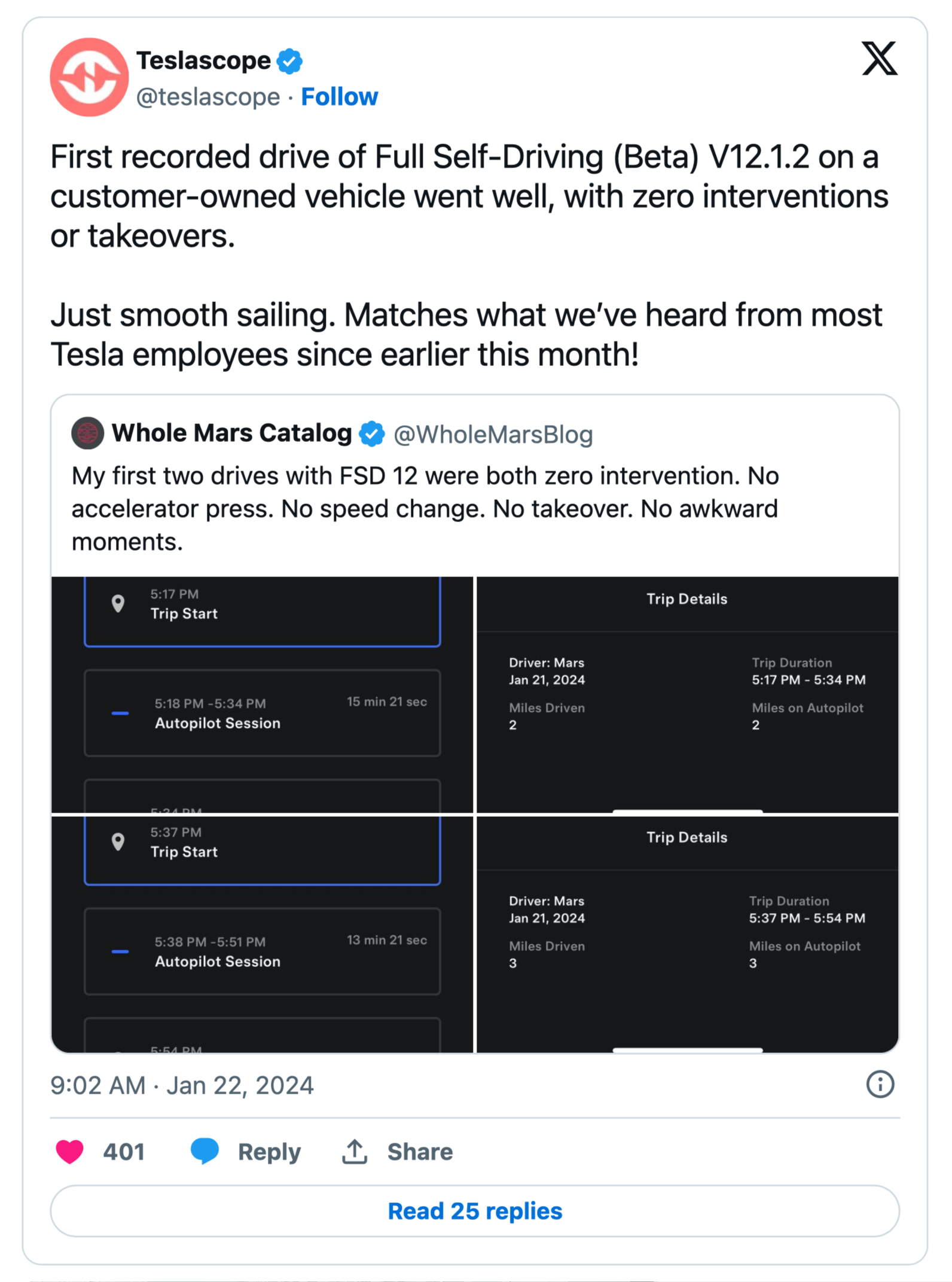 สำหรับลูกค้าที่ได้ทดลองระบบ FSD Beta เวอร์ชั่น 12.12 บนท้องถนนจริง ๆ ได้แชร์ว่าการอัปเดตครั้งนี้พัฒนาขึ้นมามากจริง ๆ สำหรับระบบการขับขี่อัตโนมัติของ Tesla โดยผู้ทดสอบส่วนใหญ่รายงานว่า ได้รับประสบการณ์การขับขี่ที่ราบรื่นมากขึ้น ด้วย FSD Beta เวอร์ชั่น 12.12 เรียกได้ว่าผู้ขับขี่แทบจะไม่ต้องเข้าไปยุ่งกับระบบหรือพ่วงมาลัยเลยแม้แต่น้อย และแทบจะไม่มีอาการที่ระบบทำงานแปลกประหลาดให้เห็นเลยก็ว่าได้
