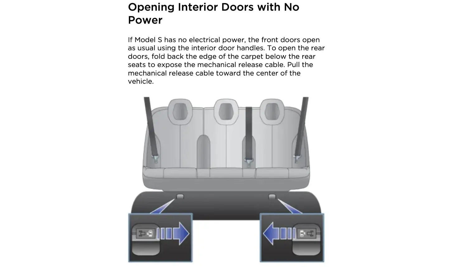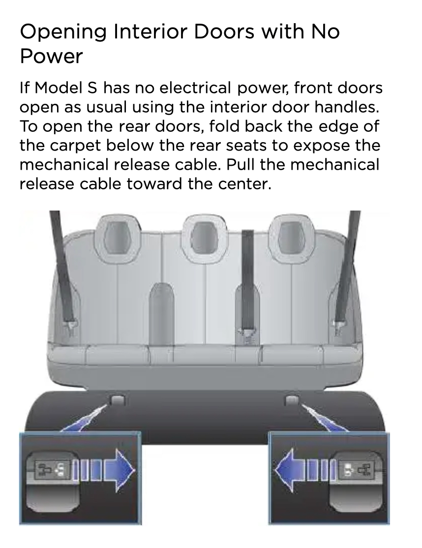 • Tesla มีระบบเปิดประตูแบบกลไกสำรอง แต่ตำแหน่งต่างกันในแต่ละรุ่น และไม่ชัดเจนสำหรับผู้โดยสารฝั่งหลัง