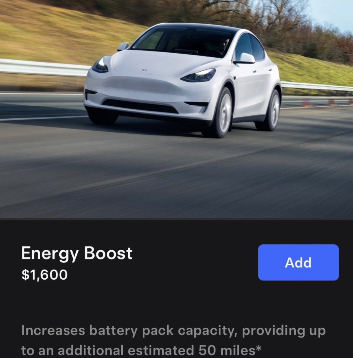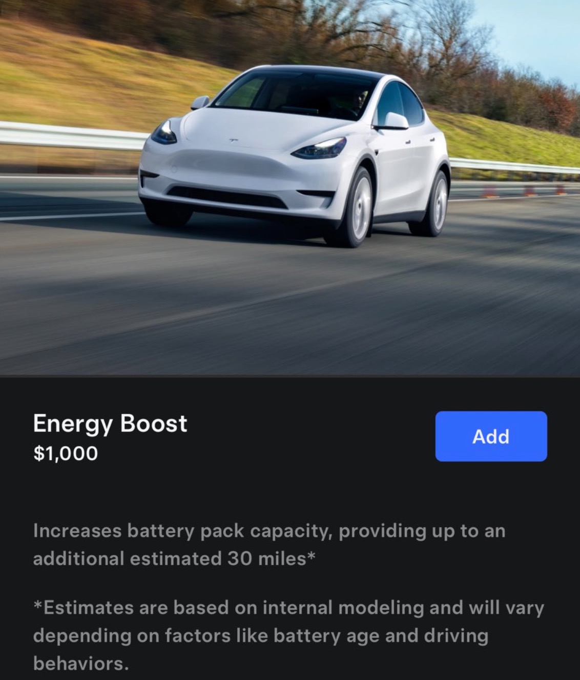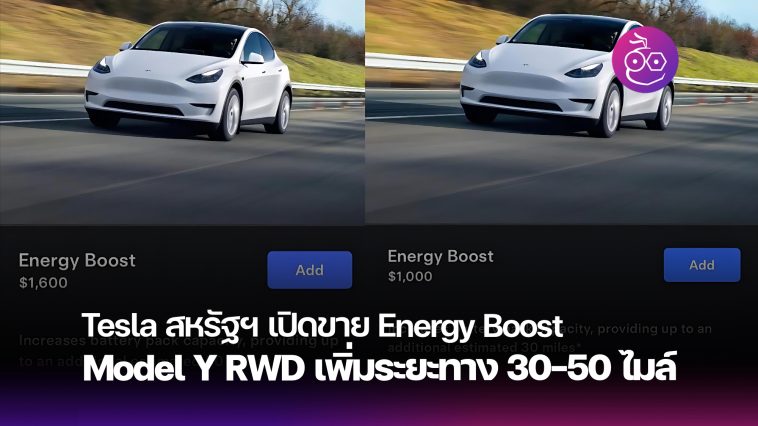 เจ้าของรถยนต์​ Tesla Model Y รุ่น RWD ในหสรัฐอเมริกาเริ่มเห็นตัวเลือกสำหรับการเพิ่มระยะทาง “Energy Boost” ในแอป Tesla บนโทรศัพท์มือถือ โดยมีตัวเลือกการเพิ่มระยะทาง 30 ไมล์ และ 50 ไมล์ ขึ้นอยู่กับแบตเตอรี่ของรถ