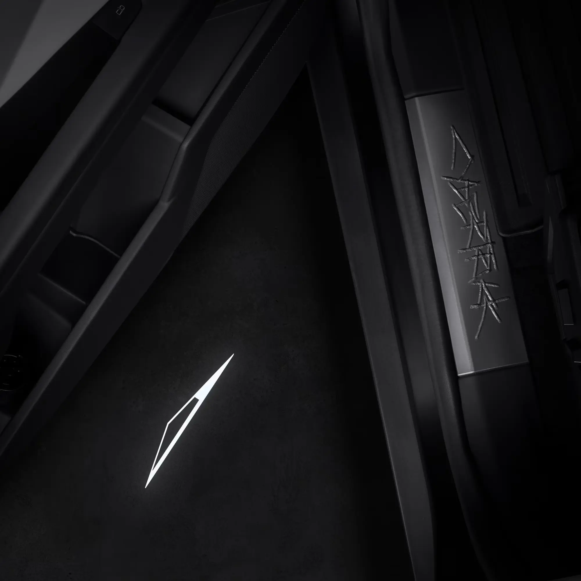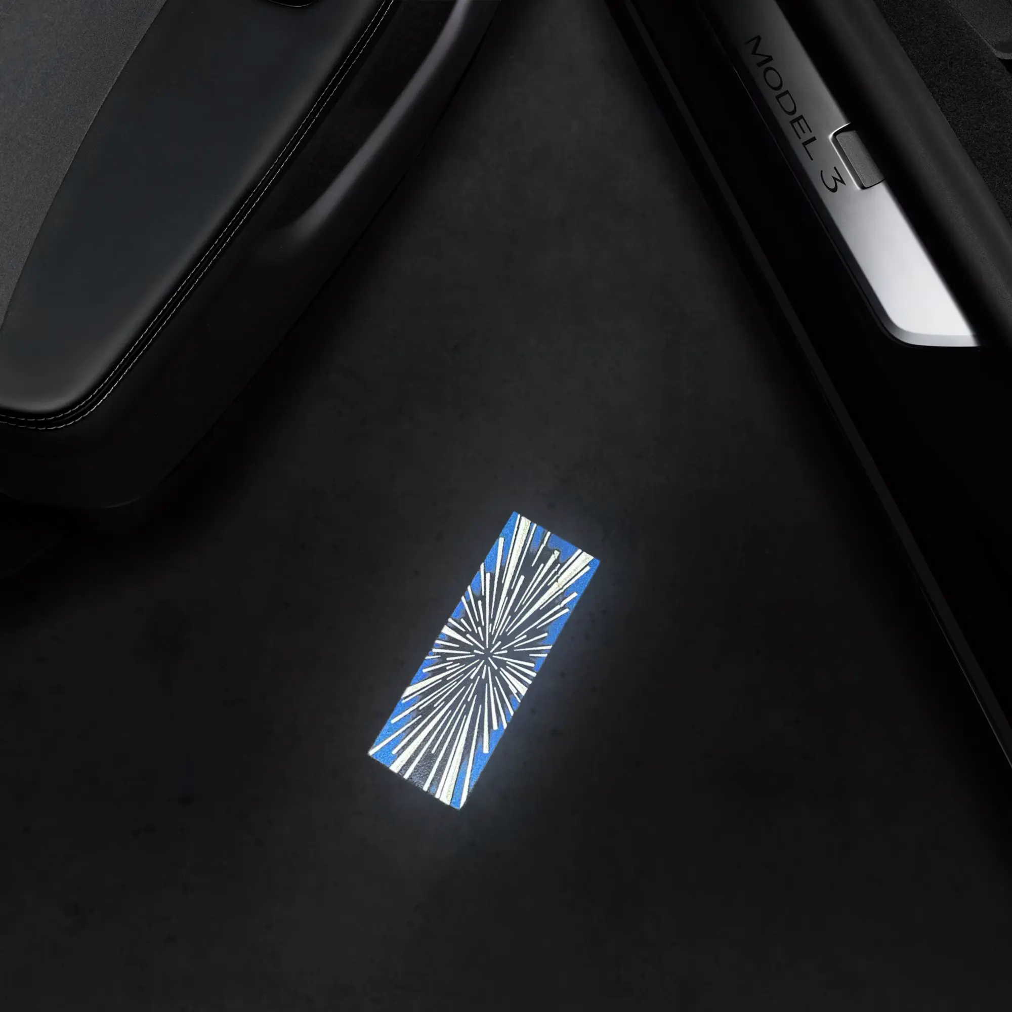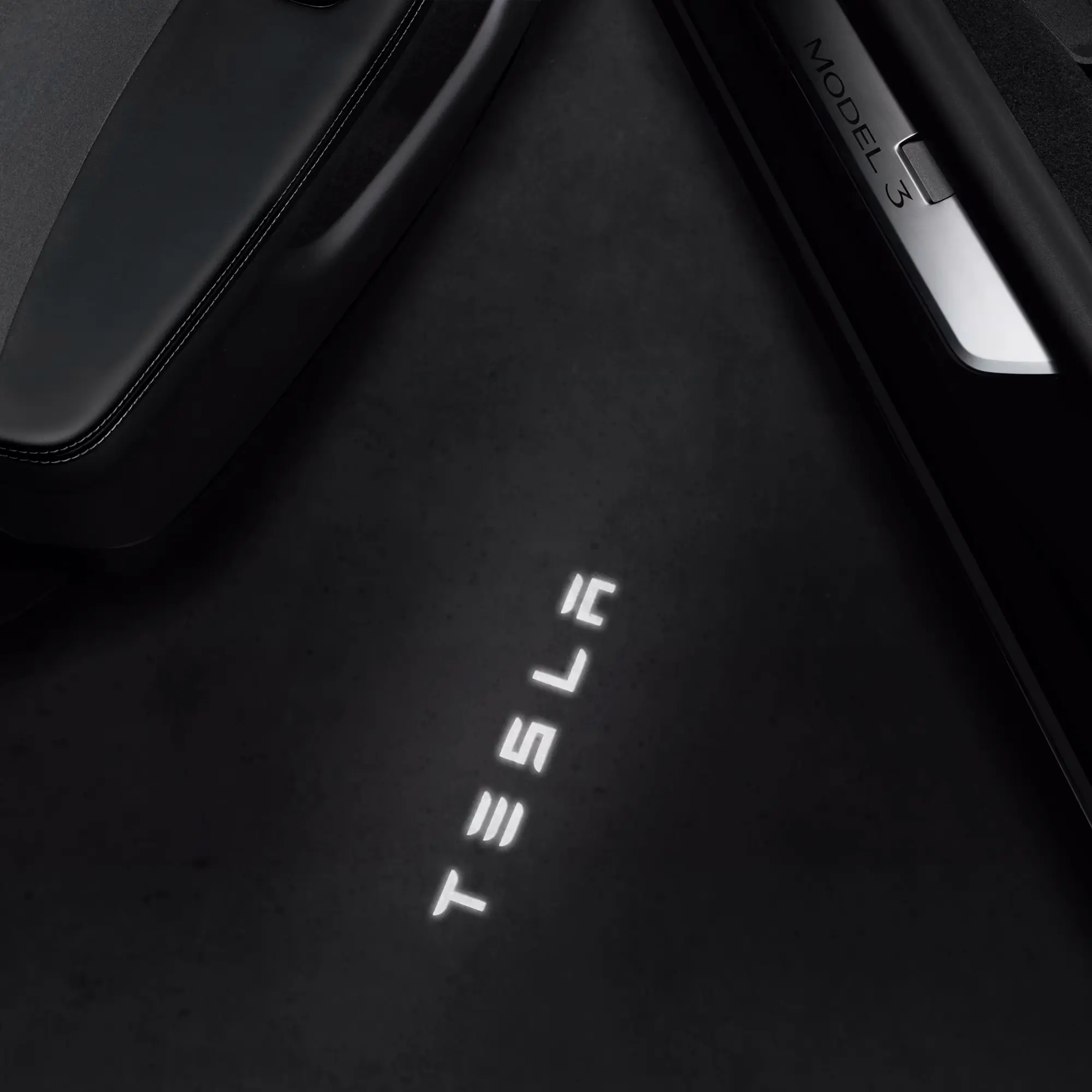 ไฟส่องพื้นโลโก้ (Projection Lights) ช่วยเพิ่มความเฉพาะตัวให้กับไฟที่ประตูรถ คล้ายกับที่มีให้เลือกอยู่แล้วสำหรับรถรุ่น Model Y (ทั้งรุ่นดั้งเดิมและรุ่นปรับโฉม) ซึ่งจะฉายตัวอักษรคำว่า Tesla และสำหรับรถ Cybertruck ที่จะฉายโลโก้ Cybertruck อย่างไรก็ตาม ไฟรุ่นนี้มีความพิเศษตรงที่เป็นตัวเลือกแรกที่มีสีสัน โดยจะฉายโลโก้ Performance สีฟ้าและขาวที่ลงบนพื้นใต้ประตูรถ