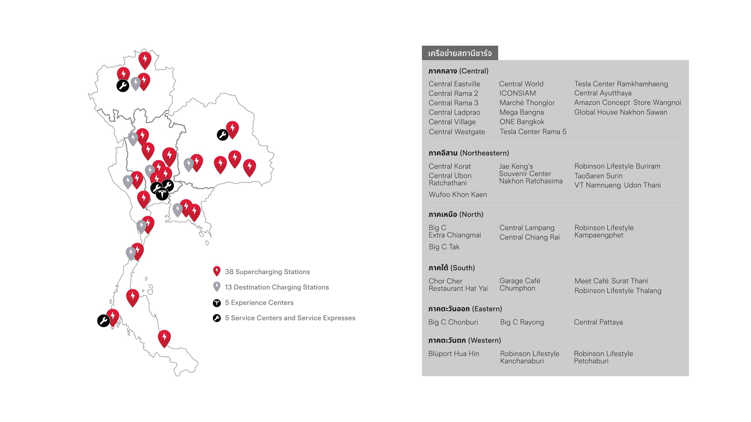 Tesla ประเทศไทยมุ่งมั่นมอบประสบการณ์การชาร์จที่ครอบคลุม โดยล่าสุดได้เปิดสถานีใหม่ที่ Central Westgate และขยายไปยังอุบลราชธานี ทำให้ปัจจุบันมีสถานี Supercharging ทั้งหมด 38 แห่ง (221 หัวชาร์จ) และสถานี Destination Charging 14 แห่ง (50 หัวชาร์จ) ทั่วประเทศ