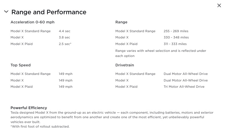 Model X รุ่น Standard Range ราคา 88,490 ดอลลาร์สหรัฐฯ ระยะทางสูงสุด 269 ไมล์ต่อการชาร์จ 1 ครั้ง (ราคาถูกลงกว่ารุ่น Long Range 10,000 ดอลลาร์สหรัฐฯ ระยะทางสั้นกว่า 79 ไมล์)