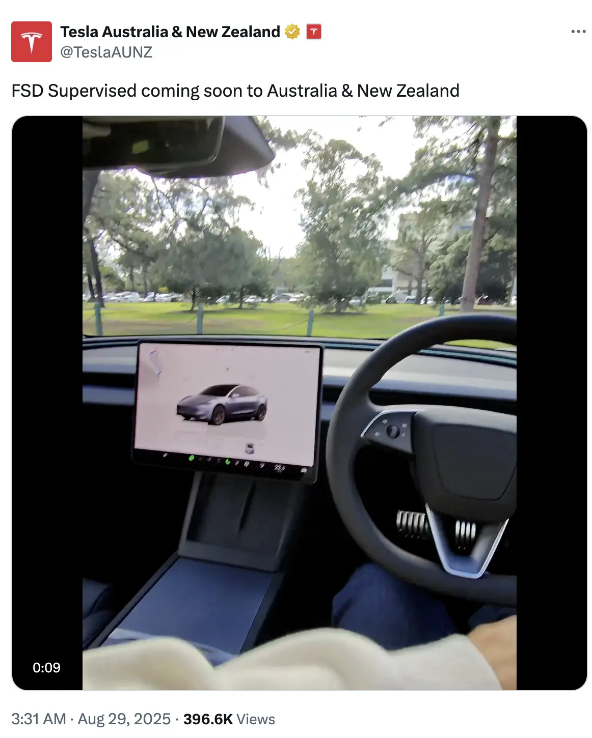 Tesla ประกาศเปิดตัวระบบช่วยเหลือการขับขี่อัตโนมัติ Full Self-Driving (Supervised) หรือ FSD อย่างเป็นทางการในประเทศออสเตรเลียและนิวซีแลนด์ ซึ่งถือเป็นก้าวสำคัญสำหรับเทสลาและลูกค้าในภูมิภาคนี้ โดยมีการประกาศผ่านแพลตฟอร์ม X ว่าทั้งสองประเทศจะเป็นตลาดใหญ่แห่งถัดไปที่จะได้รับระบบ FSD