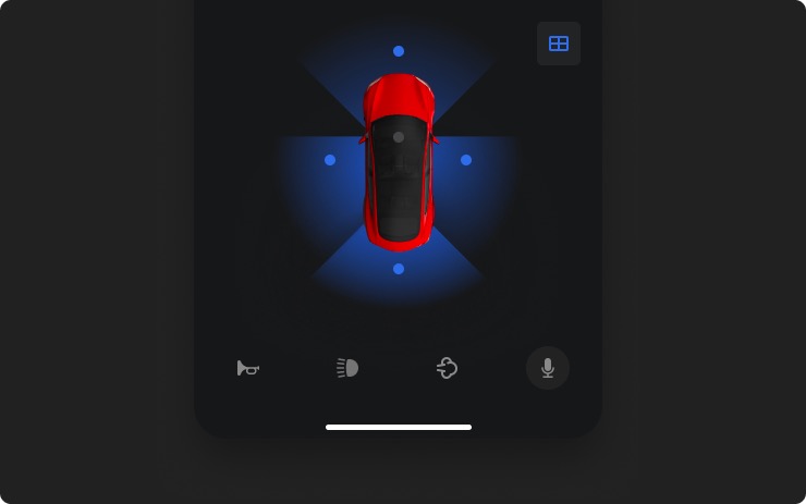 มุมมองกล้องในแอป Tesla ผู้ใช้สามารถดูกล้องหลายตัวพร้อมกัน เวลาที่ตรวจสอบรอบ ๆ รถ สามารถตั้งค่าได้ที่ Controls > Safety > View Live Camera via Mobile App ต้องใช้ Mobile App v4.22.5 และ Premium Connectivity