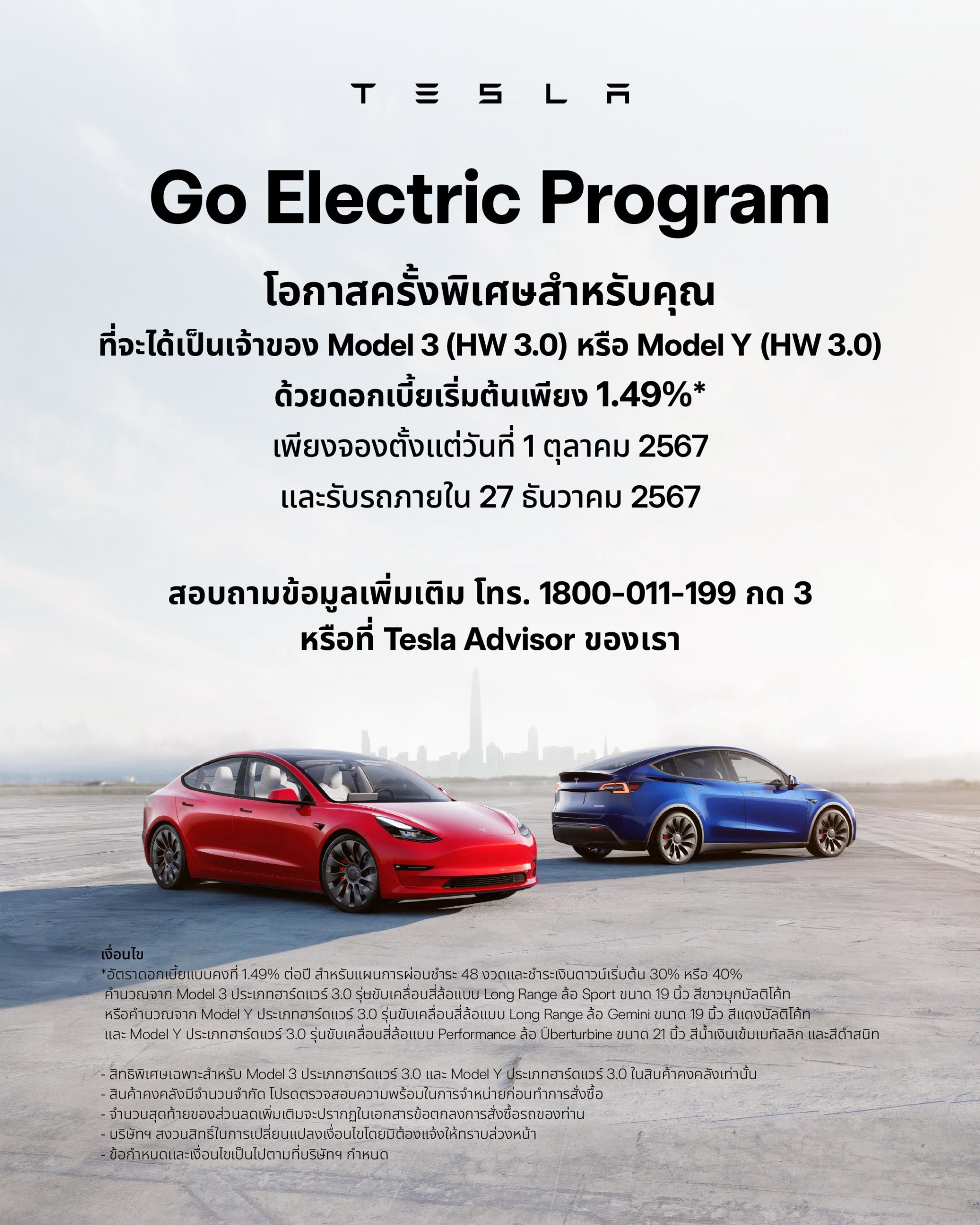 *อัตราดอกเบี้ยแบบคงที่ 1.49% ต่อปี สำหรับแผนการผ่อนชำระ 48 งวด และชำระเงินดาวน์เริ่มต้น 30% หรือ 40% คำนวณจาก Model 3 ประเภทฮาร์ดแวร์ 3.0 รุ่นขับเคลื่อนสี่ล้อแบบ Long Range ล้อ Sport ขนาด 19 นิ้ว สีขาวมุกมัลติโค้ท หรือคำนวณจาก Model Y ประเภทฮาร์ดแวร์ 3.0 รุ่นขับเคลื่อนสี่ล้อแบบ Long Range ล้อ Gemini ขนาด 19 นิ้ว สีแดงมัลติโค้ท และ Model Y ประเภทฮาร์ดแวร์ 3.0 รุ่นขับเคลื่อนสี่ล้อแบบ Performance ล้อ Überturbine ขนาด 21 นิ้ว สีน้ำเงินเข้มเมทัลลิก และสีดำสนิท
