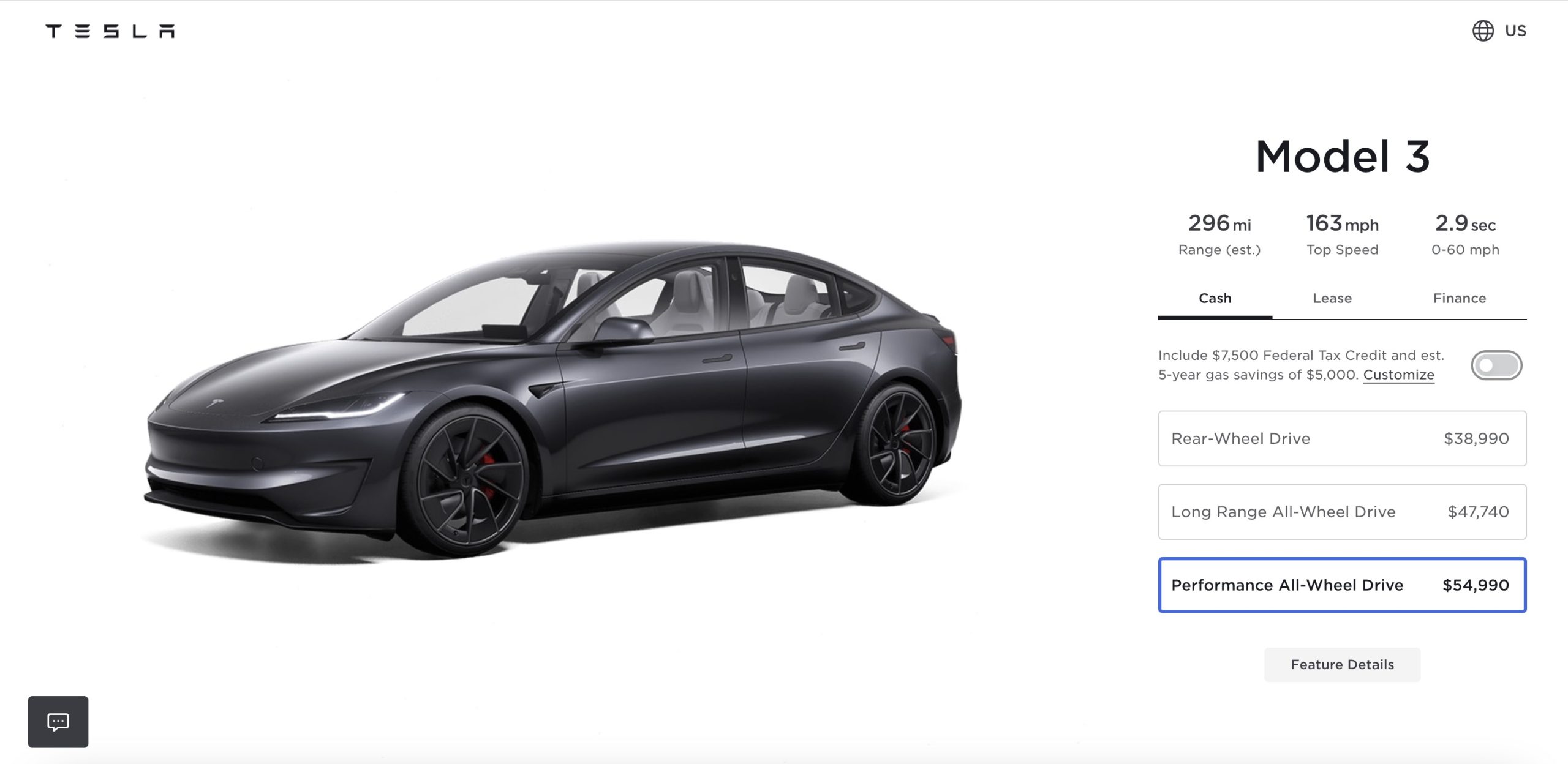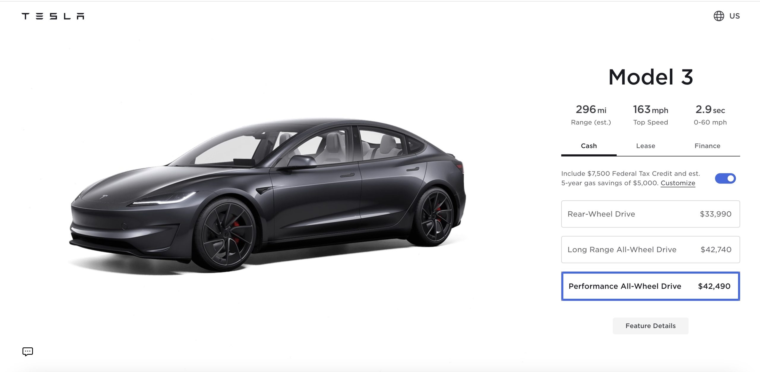 ปัจจุบัน Model 3 Performance ยังคงได้รับสิทธิ์เครดิตภาษีรัฐบาลสหรัฐฯ มูลค่า 7,500 ดอลลาร์สหรัฯ และเมื่อหักการประหยัดน้ำมันของ Tesla แล้ว จะทำให้ราคาเริ่มต้นอยู่ที่ 42,490 ดอลลาร์สหรัฐฯ (1.54 ล้านบาท)