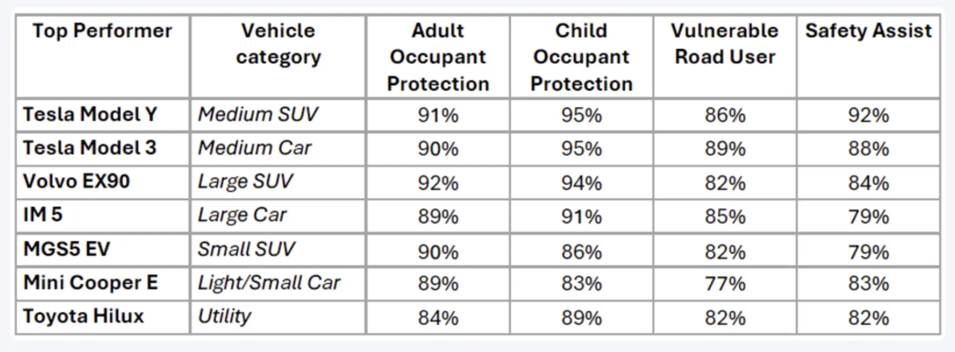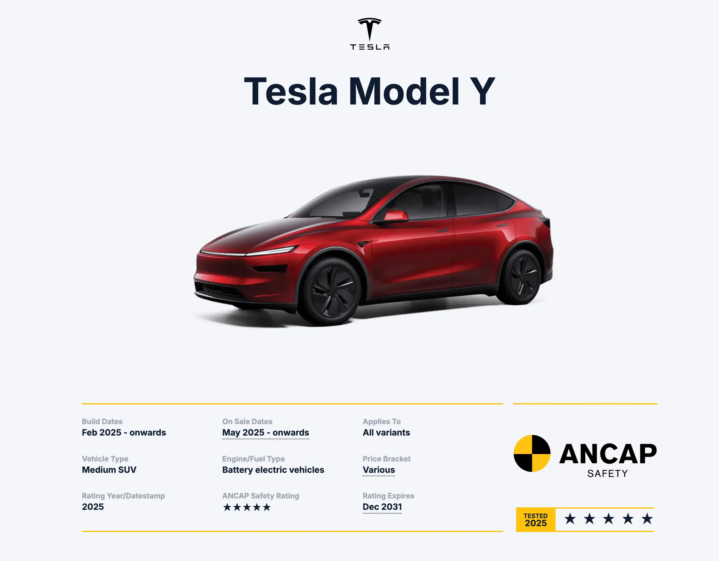 จากข้อมูลในข่าวประชาสัมพันธ์ของ ANCAP ระบุว่า Tesla Model Y ได้รับคะแนนถ่วงน้ำหนักรวมสูงสุดของรถยนต์ที่ได้รับการประเมินในปี 2025 โดยการทดสอบของ ANCAP ในปีนี้ได้ประเมินรถยนต์ผ่าน 4 เสาหลักสำคัญ ได้แก่ การปกป้องผู้โดยสารที่เป็นผู้ใหญ่, การปกป้องผู้โดยสารเด็ก, การปกป้องผู้ใช้ถนนที่มีความเปราะบาง (เช่น คนเดินเท้า), และเทคโนโลยีช่วยเหลือด้านความปลอดภัย (Safety Assist)