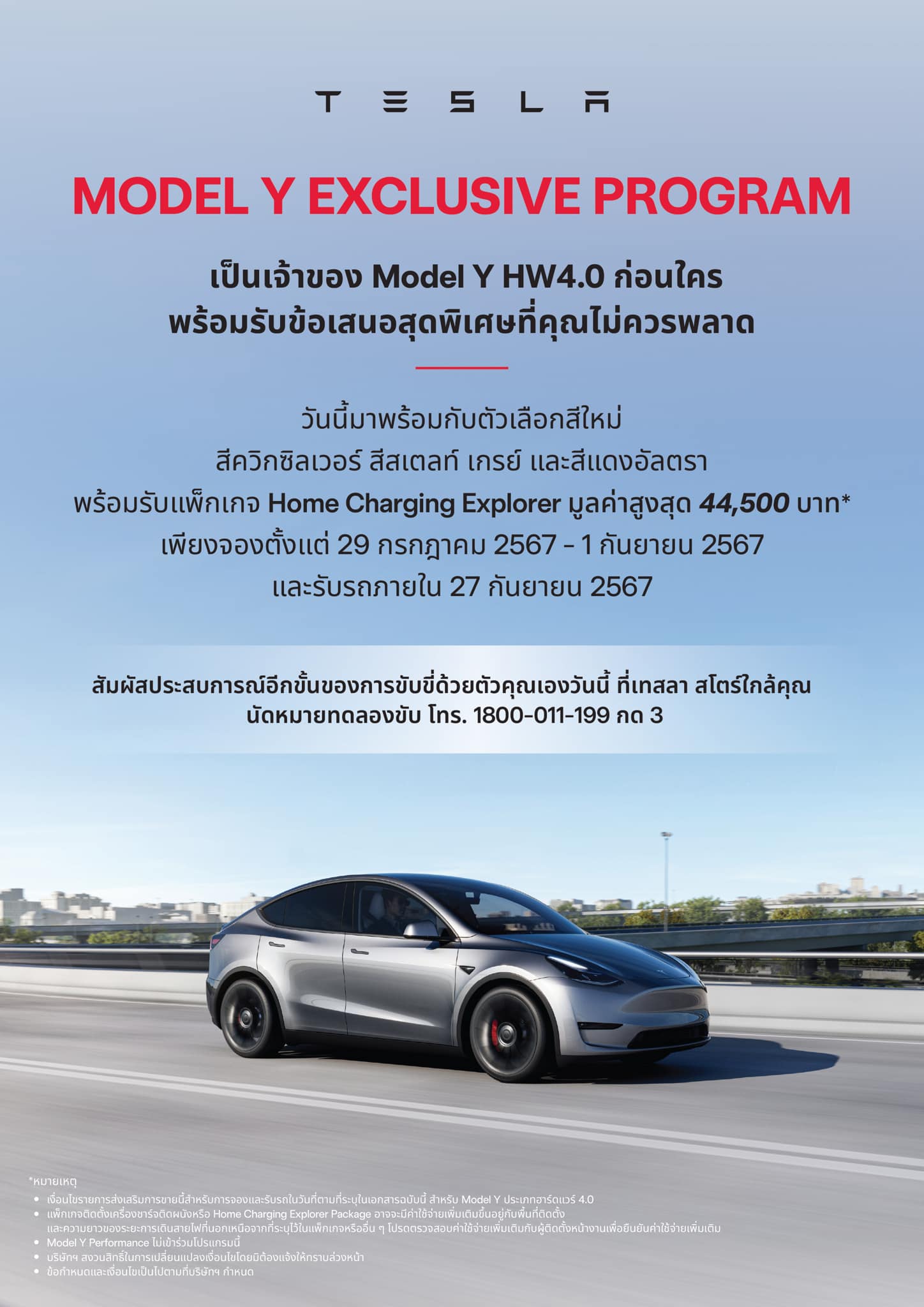 Tesla ประกาศโปรแกรมใหม่ช่วงสิ้นเดือน Model Y Exclusive Program สำหรับผู้ที่จอง Model Y HW 4.0 ตั้งแต่วันที่ 29 กรกฎาคม – 1 กันยายน 2567 และรับรถภายในวันที่ 27 กันยายน รับฟรี! แพ็กเกจ Home Charging Explorer เครื่องชาร์จที่บ้าน มูลค่าสูงสุด 44,500 บาท*