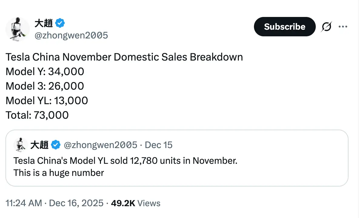 ผลรวมจากเดือนพฤศจิกายนชี้ให้เห็นว่า Tesla Model Y คว้าตำแหน่งรถ SUV ที่ขายดีที่สุดอันดับ 1 ในจีน ด้วยยอดส่งมอบราว 34,000 คัน (และหากรวมรุ่น Model Y L เข้าไป ตัวเลขนี้จะยิ่งสูงขึ้น) ส่วน Tesla Model 3 ก็ทำผลงานได้ยอดเยี่ยมเช่นกัน โดยมียอดส่งมอบ 25,700 คันในเดือนพฤศจิกายน 2025