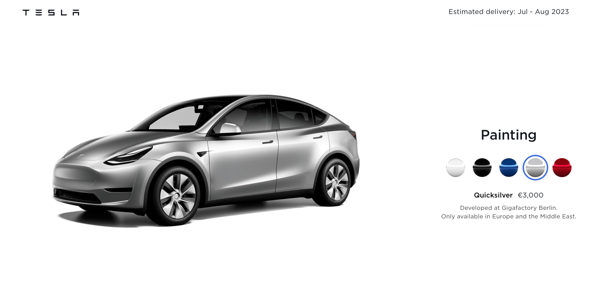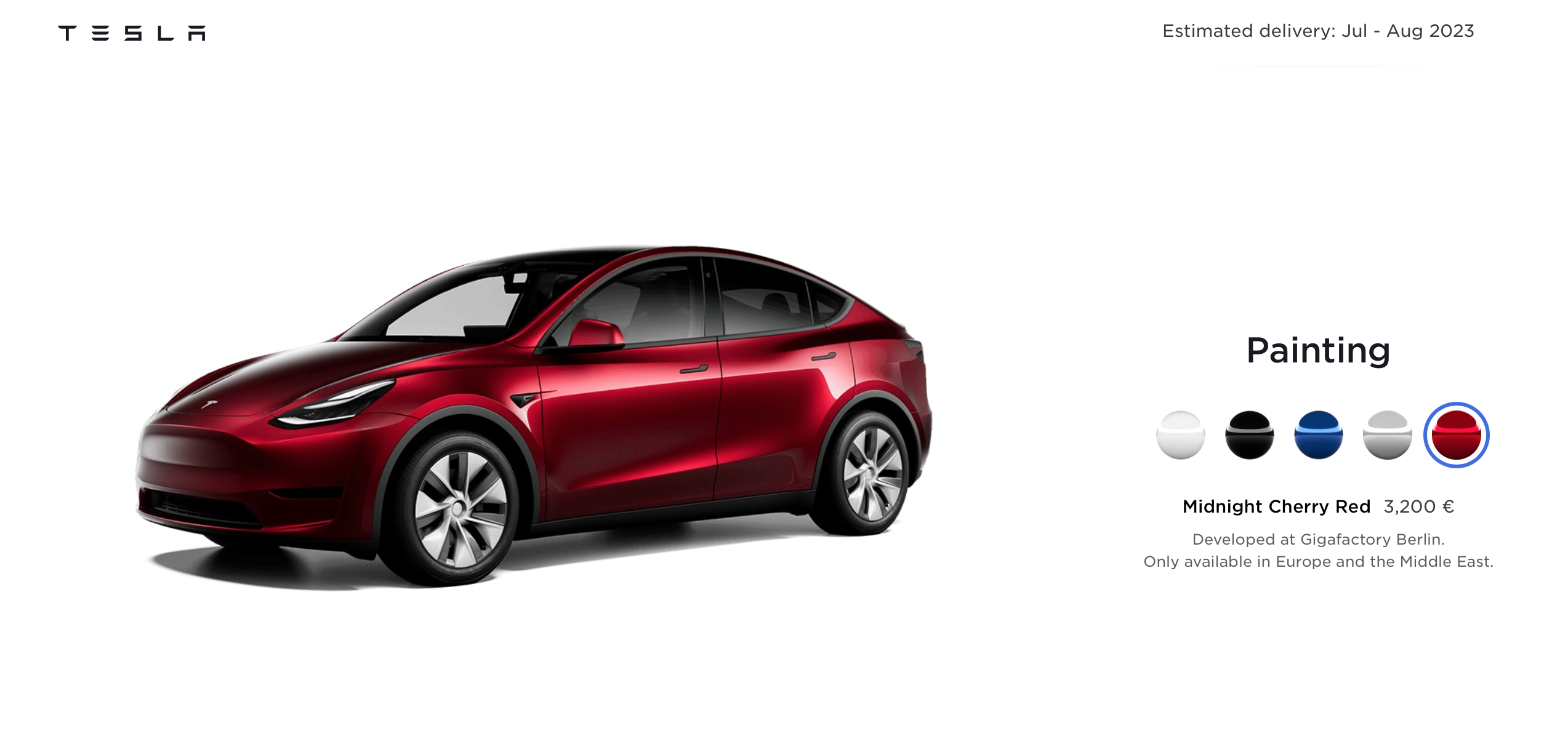 สี Midnight Cherry Red และ Quicksilver เป็นสีพิเศษที่ผลิตที่โรงงาน Giga Berlin เท่านั้น ความพร้อมที่ให้ลูกค้าสั่งซื้อ 2 สีพิเศษนี้ สำหรับรุ่น Model Y RWD แสดงให้เห็นว่าโรงงาน Giga Berlin ได้เพิ่มกำลังการผลิต ซึ่งก่อนหน้านี้รุ่น Model Y RWD ในยุโรปจะผลิตในประเทศจีนที่โรงงาน Giga Shanghai