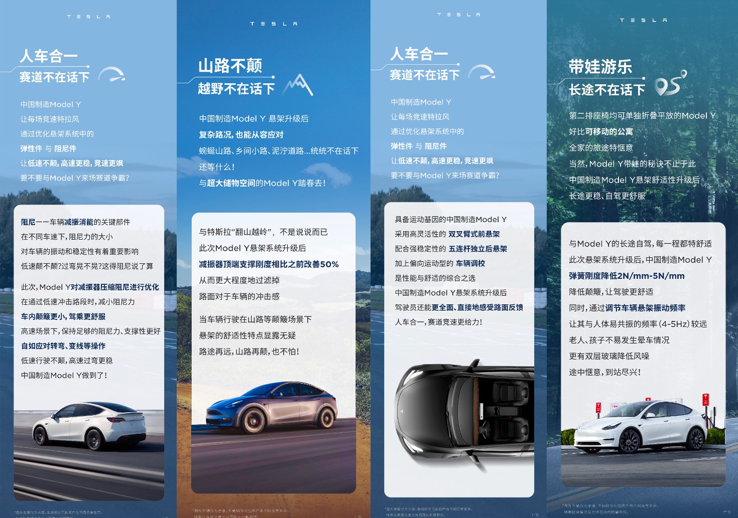 จากการแปลได้คร่าวๆ ระบุว่า ความแข็งของสปริงช่วงล่างใหม่ของ Model Y ลดลง 2-5 นิวตัน/มม. ส่งผลให้ช่วงล่างมีความนุ่มนวลมากขึ้น ลดแรงกระแทกได้อย่างมีประสิทธิภาพ และส่งผลไปถึงผู้โดยสารตอนหลัง ทำให้เด็กและผู้สูงอายุนั่งได้สบายมากขึ้น ไม่รู้สึกถึงความแข็งของช่วงล่าง