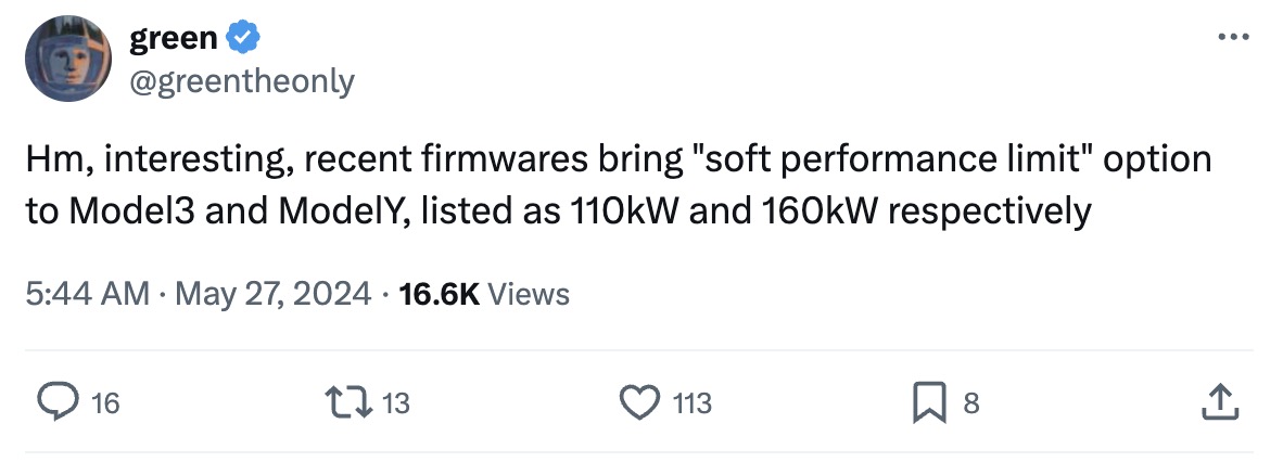 Green ได้เผยแพร่ผ่านบัญชี X เกี่ยวกับการพบตัวเลือกชื่อว่า “soft performance limit” ที่อยู่ในชุดคำสั่งของซอฟต์แวร์เวอร์ชันล่าสุด คำสั่งนี้มีไว้สำหรับรถรุ่น Model 3 และ Model Y