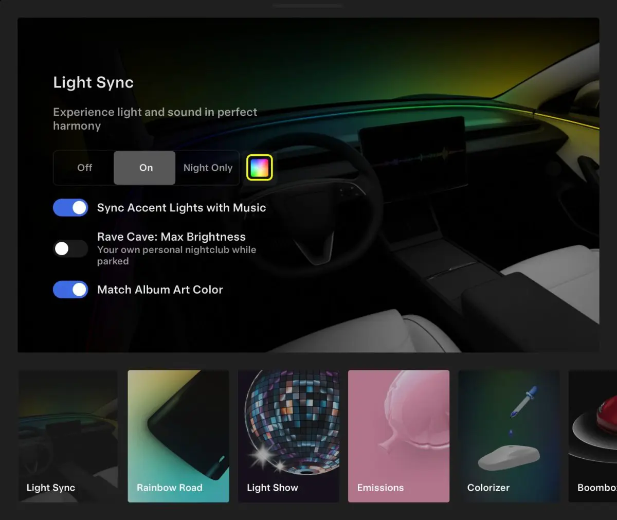 ผู้ใช้ยังสามารถเพิ่มความสว่างของไฟ Ambient Light ให้สูงสุดเมื่อเปิดใช้งานคุณสมบัตินี้ แต่จะทำได้เฉพาะเมื่อรถจอดอยู่เท่านั้น ซึ่ง Tesla เรียกว่า Rave Cave