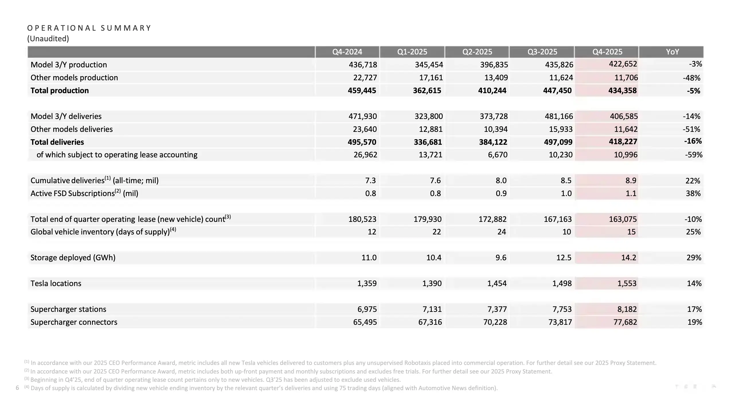 รายงานผลประกอบการประจำไตรมาสที่ 4 และสรุปภาพรวมปี 2025 เปิดเผยผ่านเอกสารแจ้งผู้ถือหุ้นบนเว็บไซต์นักลงทุนสัมพันธ์ หลังจากตลาดหุ้นปิดทำการเมื่อวันที่ 28 มกราคม 2026 โดยในไตรมาสที่ 4 นี้ Tesla สามารถผลิตรถยนต์ได้กว่า 434,000 คัน ส่งมอบรถได้กว่า 418,000 คัน และติดตั้งผลิตภัณฑ์จัดเก็บพลังงานไปได้ถึง 14.2 GWh