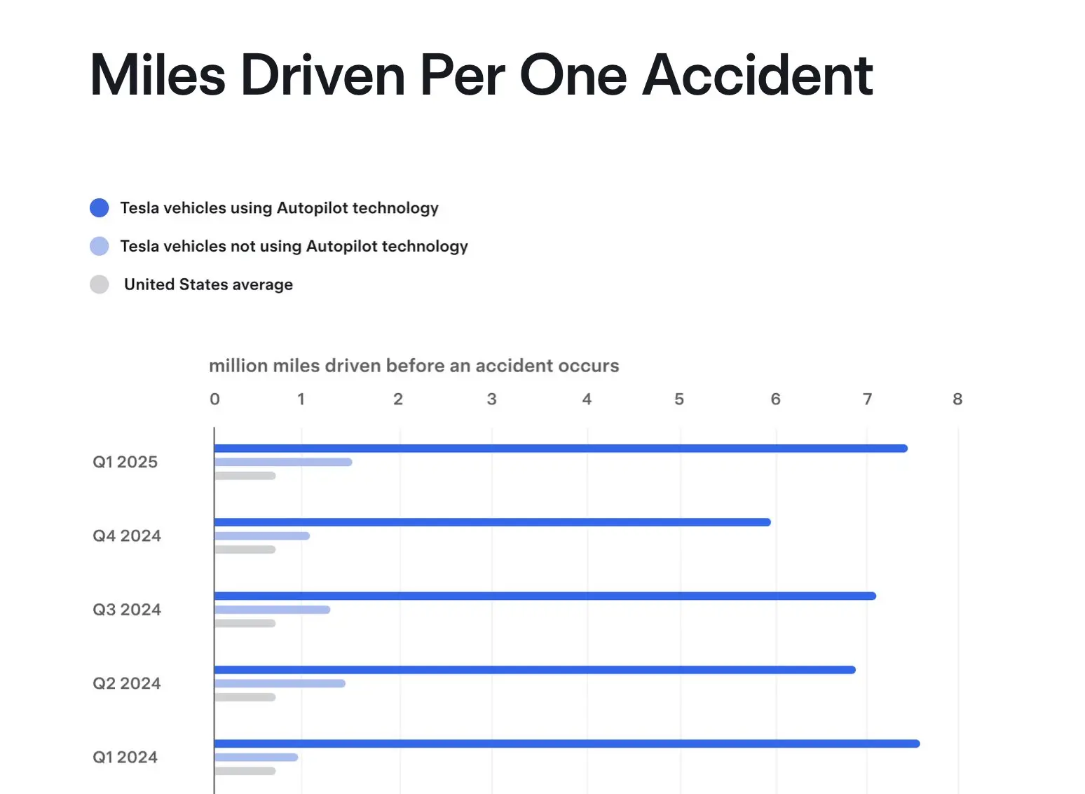 แต่เมื่อเทียบกับไตรมาสแรกของปี 2024 ที่มีอุบัติเหตุ 1 ครั้งต่อ 7.63 ล้านไมล์ ตัวเลขล่าสุดถือว่าลดลงเล็กน้อย