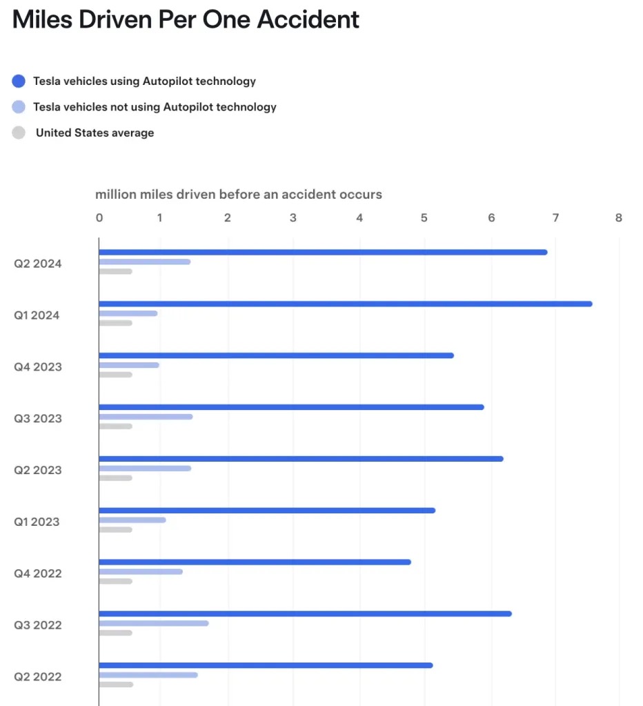 โดยไตรมาสที่ 1 ปี 2024 ที่ผ่านมา บันทึกอุบัติเหตุได้ 1 ครั้งในทุก 7.63 ล้านไมล์ที่ขับโดยผู้ขับขี่ที่ใช้ Autopilot ส่วนผู้ขับขี่ที่ไม่ได้ใช้ Autopilot สามารถบันทึกการชนหนึ่งครั้งได้ในทุก 955,000 ไมล์ เมื่อเทียบกับไตรมาสที่ 2 แล้วการเกิดอุบัติเหตุในไตรมาสที่ 1 น้อยกว่าเล็กน้อย