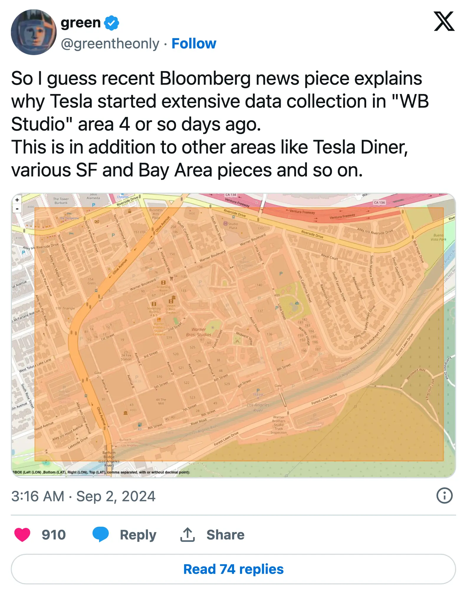 งานนี้จะจัดขึ้นเดือนหน้าที่สตูดิโอ Warner Bros. ในลอสแองเจลิส โดยแฮ็กเกอร์ชื่อดังที่รู้จักกันในนาม “green” (ในแพลตฟอร์ม X) มักจะขุดข้อมูลจากการอัปเดตซอฟต์แวร์ของ Tesla ออกมาเปิดเผยว่า Tesla ได้เริ่มเก็บข้อมูลใหม่ในพื้นที่ที่ Robotaxi จะเปิดตัว โดยเรียกโปรเจกต์นี้ว่า “WB Studio”