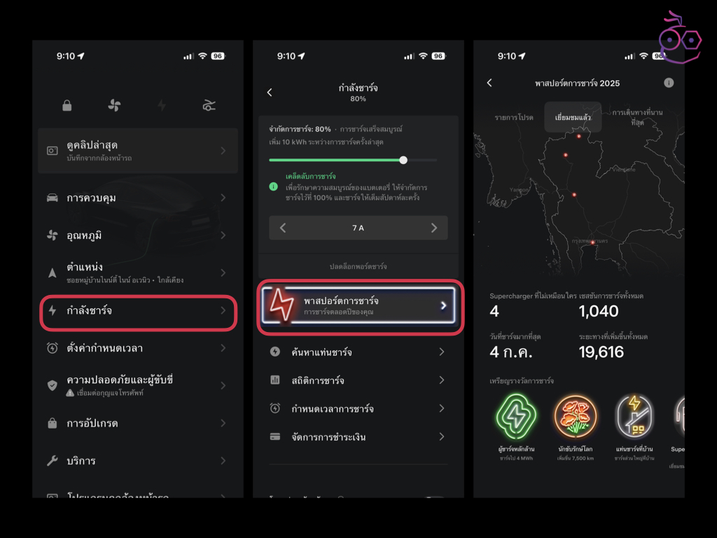 - Charging badges: เหรียญตราสัญลักษณ์พิเศษเมื่อไปเยือนจุดชาร์จที่เป็นแลนด์มาร์ค เช่น Tesla Diner, Oasis Supercharger หรือเหรียญนักสำรวจ (Explorer Badge) และอื่นๆ