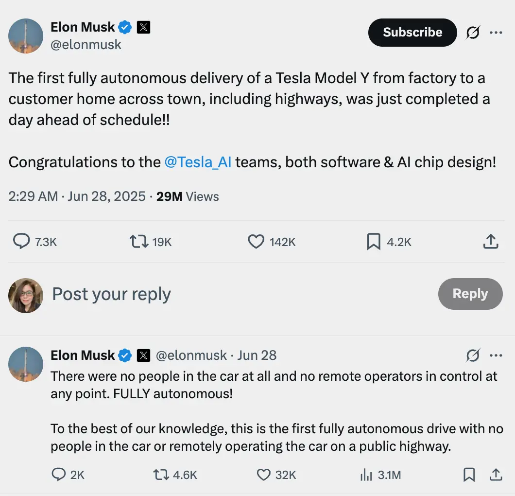 Elon Musk กล่าวเพิ่มเติมบน X ว่า “ไม่มีคนอยู่ในรถเลยแม้แต่คนเดียว และไม่มีผู้ควบคุมจากระยะไกลเข้าควบคุมเลย เป็นการขับขี่ไร้คนขับเต็มรูปแบบ! และนี่คือการขับขี่แบบไร้คนขับเต็มรูปแบบครั้งแรกที่ไม่มีคนอยู่ในรถหรือควบคุมรถจากระยะไกลบนทางหลวงสาธารณะ”