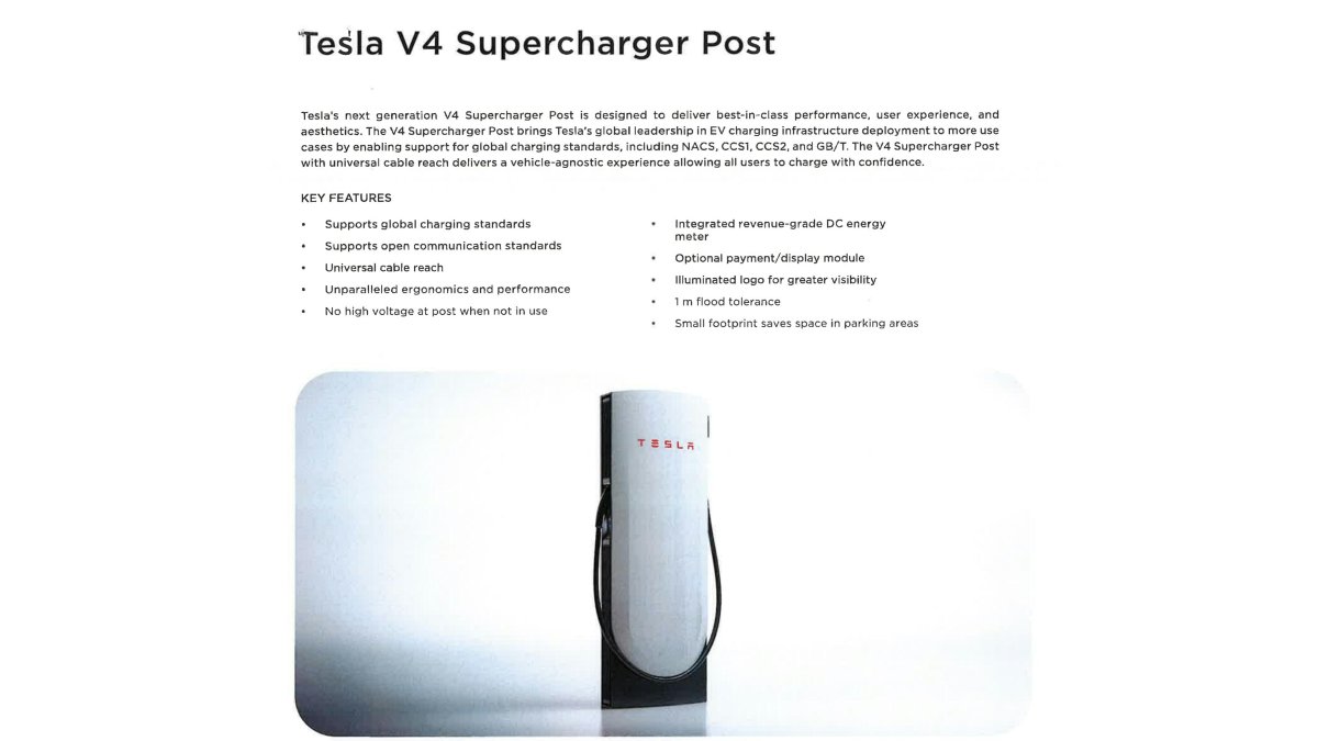 @MarcoRPi1 ผู้ใชับัญชี X ที่มักจะอัปเดตข่าวสารเกี่ยวกับ Supercharger ได้โพสต์ข้อมูลสเปคของเครื่องชาร์จ Supercharger V4 ใหม่ว่า เครื่องชาร์จสามารถจ่ายกระแสไฟฟ้าได้ 250kW (อาจะมีการเพิ่มขึ้นอีกในอนาคต) มีช่วงแรงดันไฟฟ้ากระแสตรง 0-5000VDC รองรับการชาร์จรถยนต์ไฟฟ้า (EV) หลากหลายรุ่น