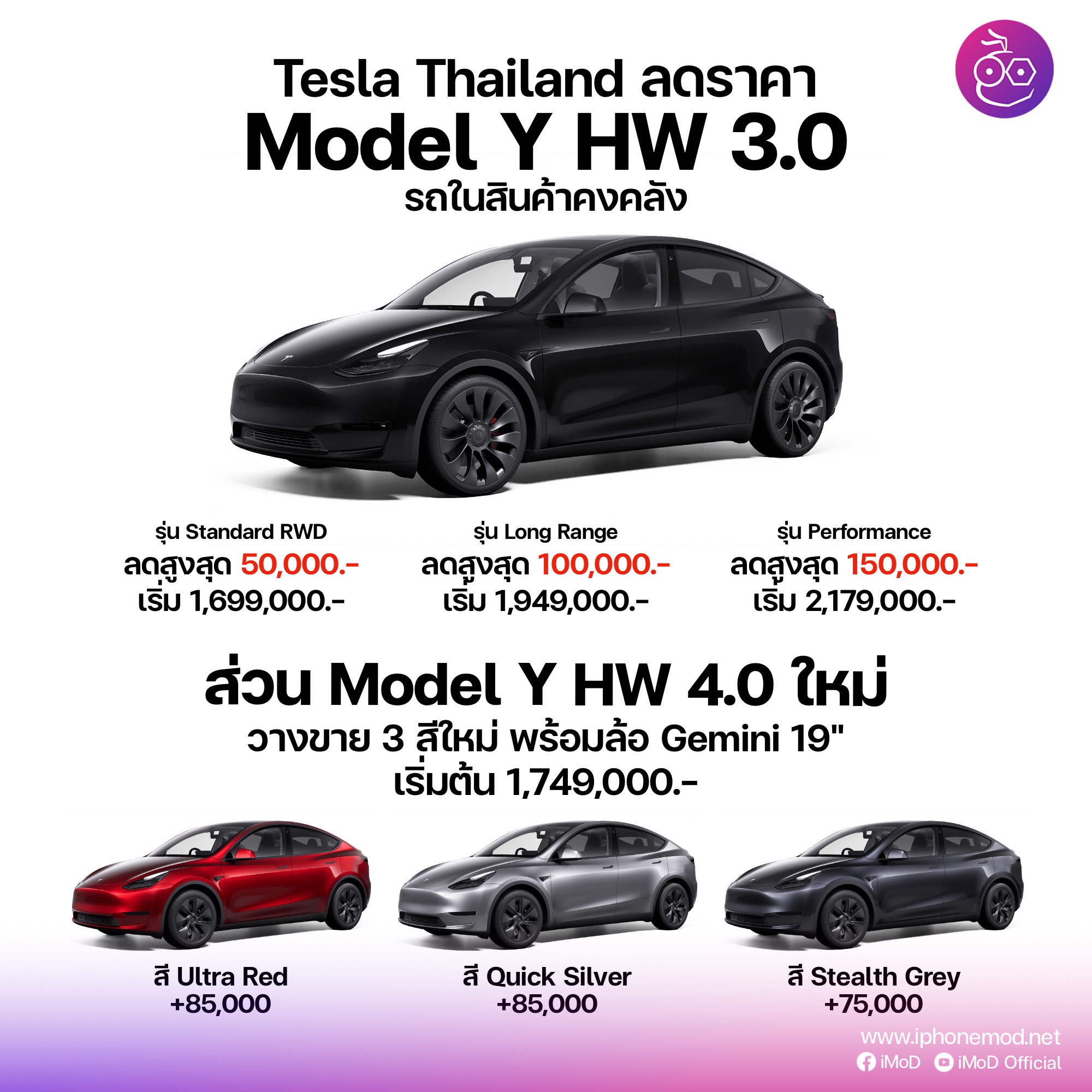 Tesla ปรับลดราคา Model Y รุ่น HW 3.0 สินค้าคงคลัง สูงสุด 150,000 บาท พร้อมวางขาย Model Y รุ่น HW 4.0 พร้อมเพิ่มสีใหม่และล้อลายใหม่ในราคาเดิม เริ่มต้น 1.749 ล้านบาท