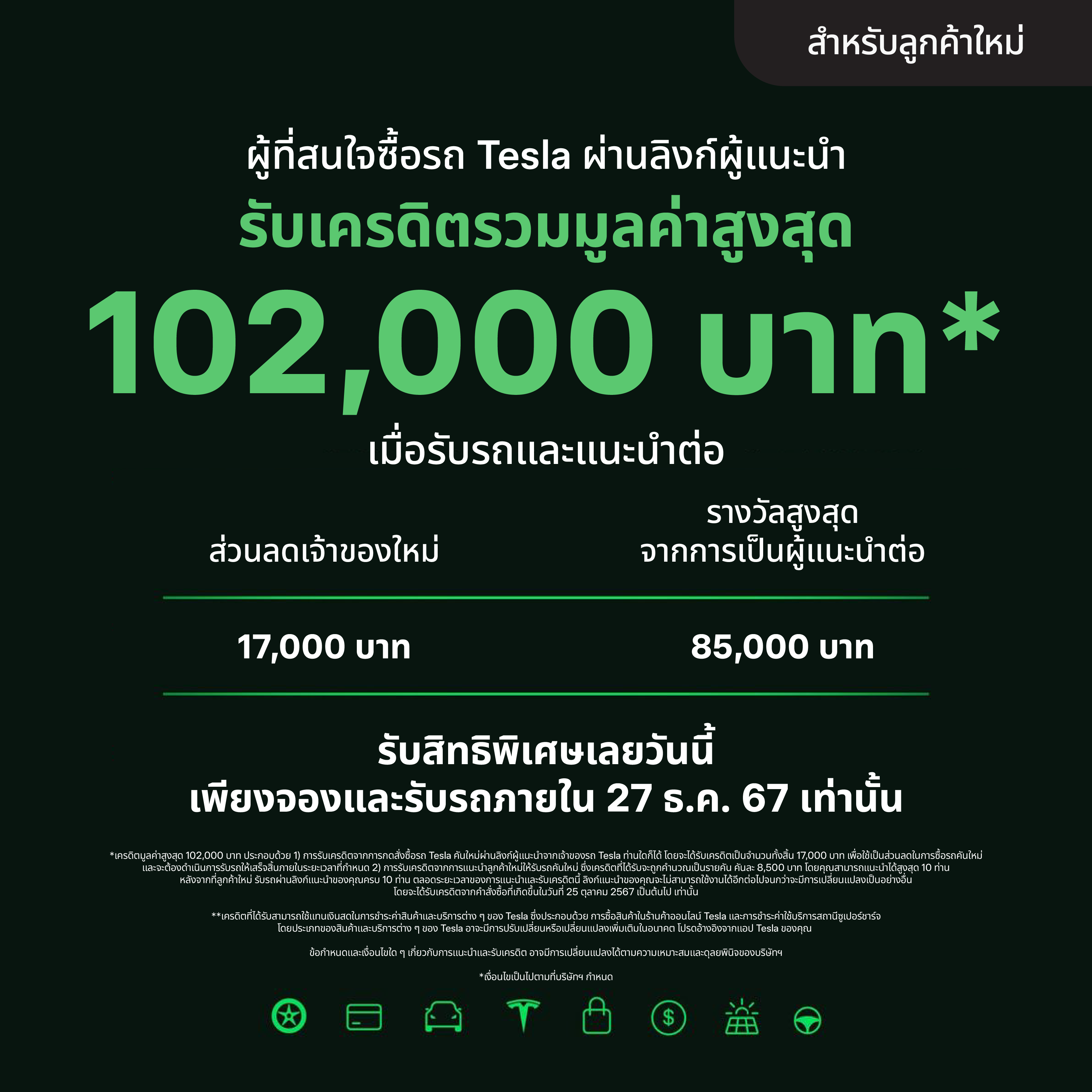 สำหรับลูกค้าใหม่ ผู้ที่สนใจซื้อรถ Tesla ผ่านลิงก์ผู้แนะนำ รับเครดิตรวมมูลค่าสูงสุด 102,000 บาท* เมื่อรับรถและแนะนำต่อ ส่วนลดเจ้าของใหม่ 17,000 บาท รางวัลสูงสุดจากการเป็นผู้แนะนำต่อ 85,000 บาท รับสิทธิพิเศษเลยวันนี้ เพียงจองและรับรถภายในวันที่ 27 ธ.ค. 67 นี้เท่านั้น