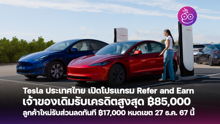 Tesla ประเทศไทย เปิดโปรแกรมพิเศษ Refer and Earn ผู้แนะนำรับเครดิตสูงสุด 85,000 บาท และลูกค้าใหม่ที่ซื้อผ่านการแนะนำ รับส่วนลดทันที 17,000 บาท เพียงจองและรับรถภายในวันที่ 27 ธ.ค. 67 นี้