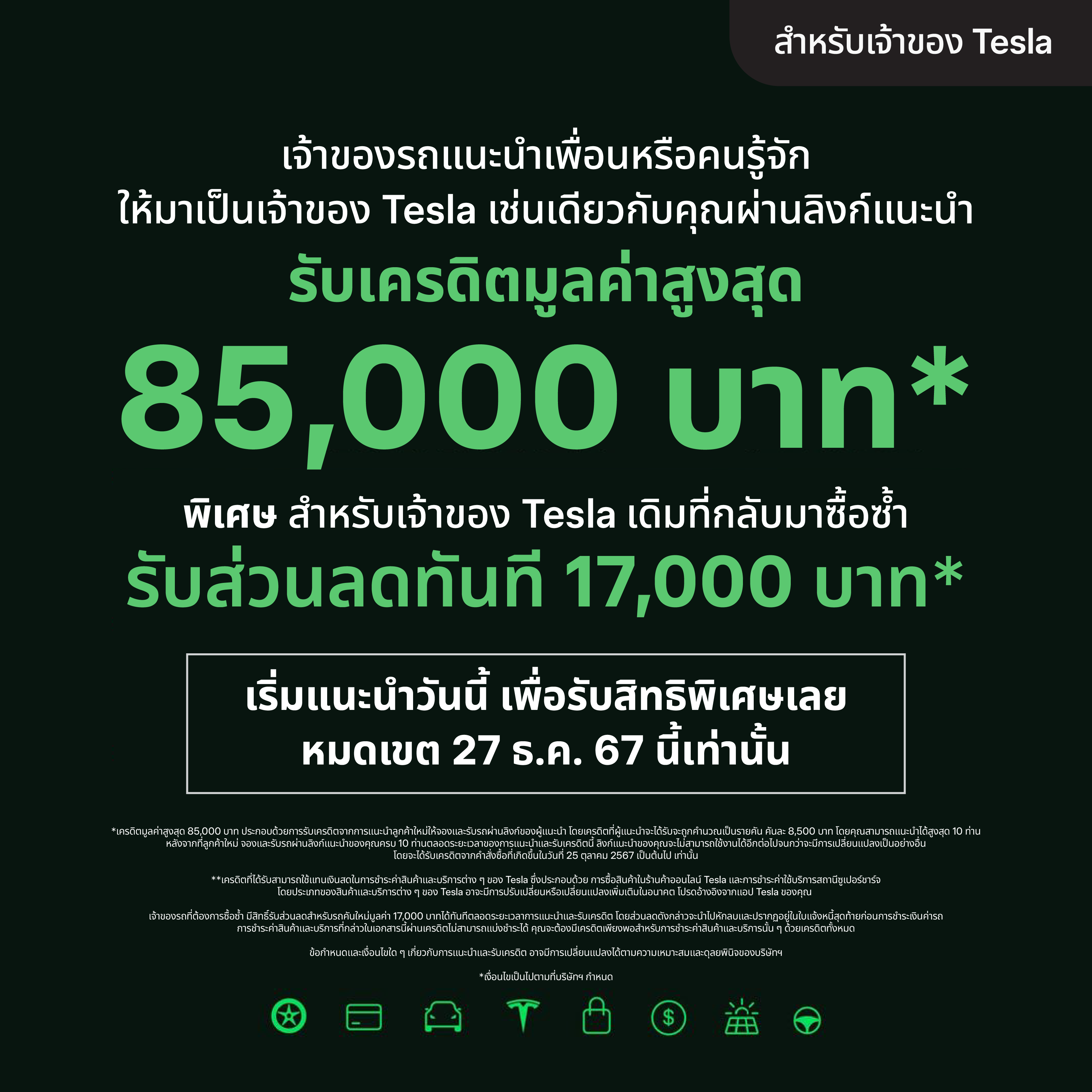 สำหรับผู้ที่เป็นเจ้าของ Tesla เพียงเจ้าของรถแนะนำเพื่อนหรือคนรู้จัก ให้มาเป็นเจ้าของ Tesla เช่นเดียวกับคุณผ่านลิงก์แนะนำ รับเครดิตมูลค่าสูงสุด 85,000 บาท* พิเศษสำหรับเจ้าของรถ Tesla เดิมที่กลับมาซื้อซ้ำ รับส่วนลดทันที 17,000 บาท*