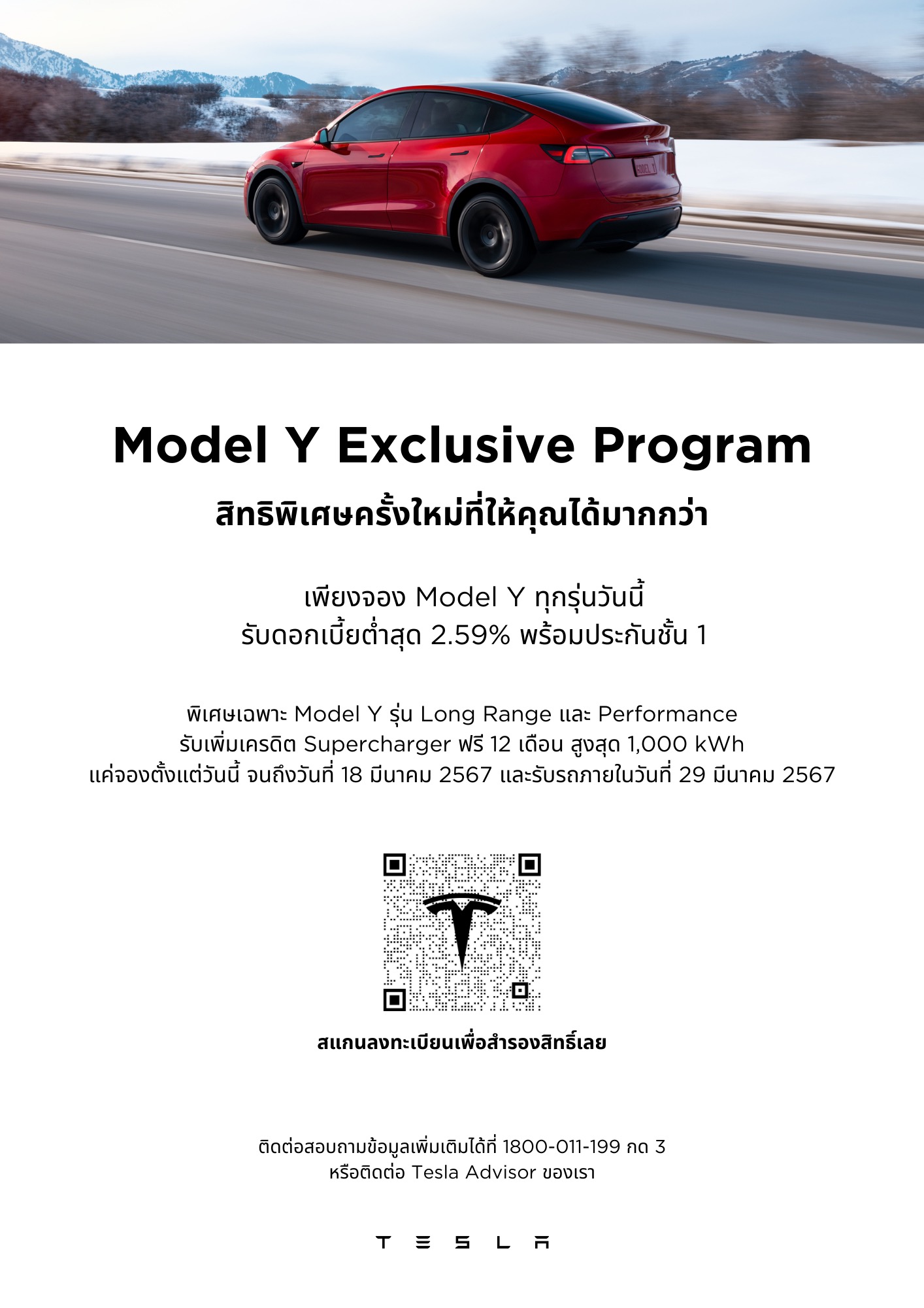ลงทะเบียนรับสิทธิ์ได้เลยที่ https://www.tesla.com/th_th/event/model-y-exclusive-program