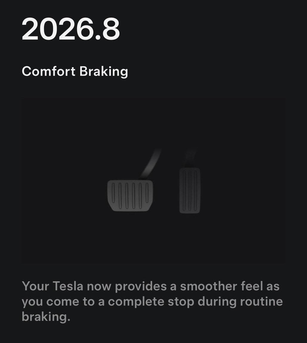Tesla กำลังเริ่มปล่อยฟีเจอร์ใหม่ที่ชื่อว่า Comfort Braking พร้อมกับการอัปเดตซอฟต์แวร์เวอร์ชัน 2026.8 โดยฟีเจอร์นี้จะสงวนไว้สำหรับรถยนต์ Model Y รุ่นใหม่เท่านั้น และยังไม่มีให้ใช้งานในรถยนต์รุ่นอื่น ๆ ของ Tesla ในขณะนี้