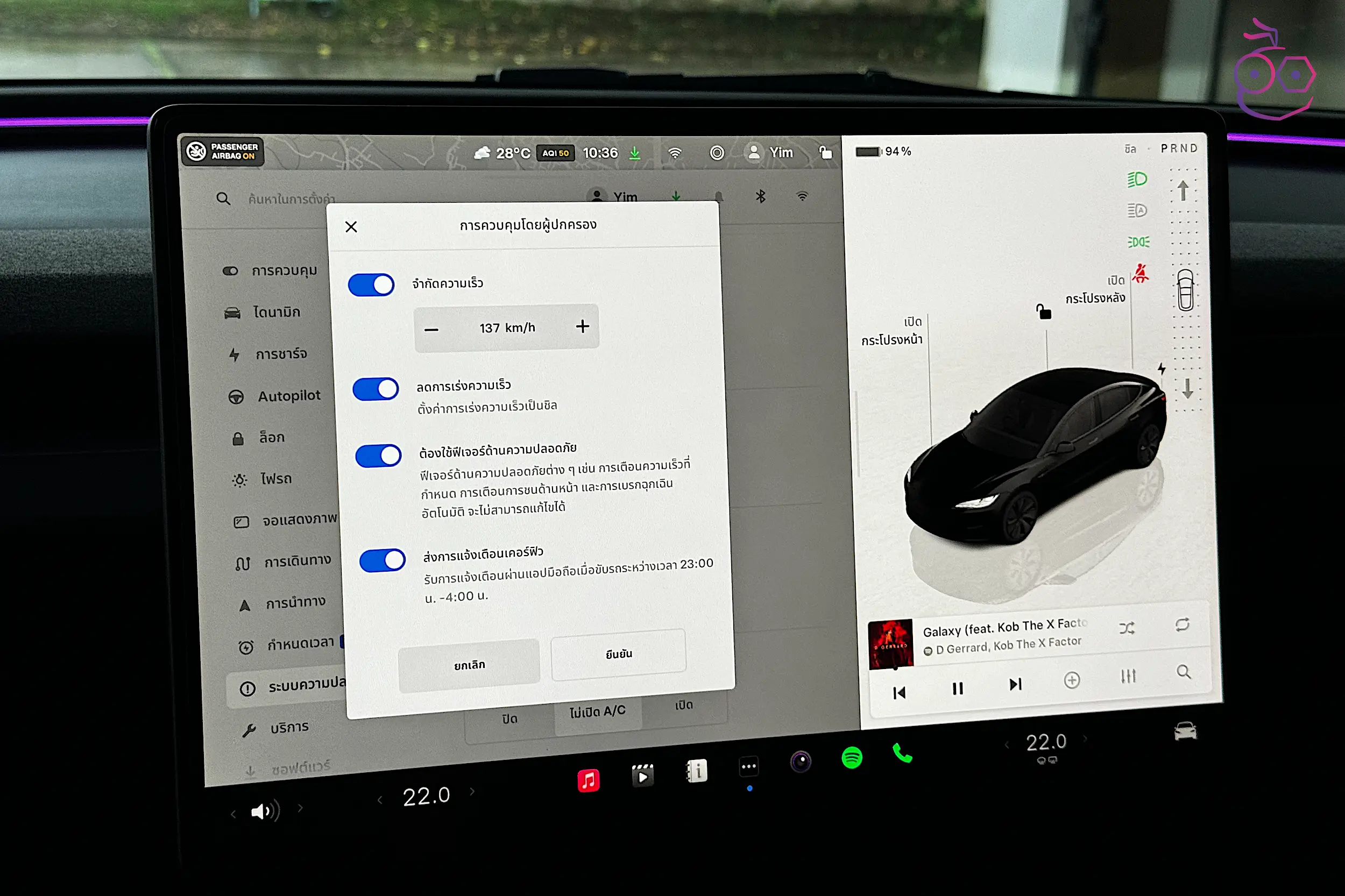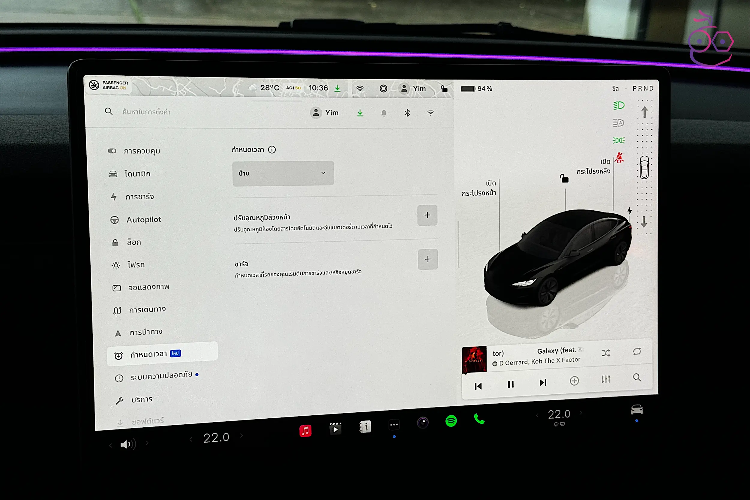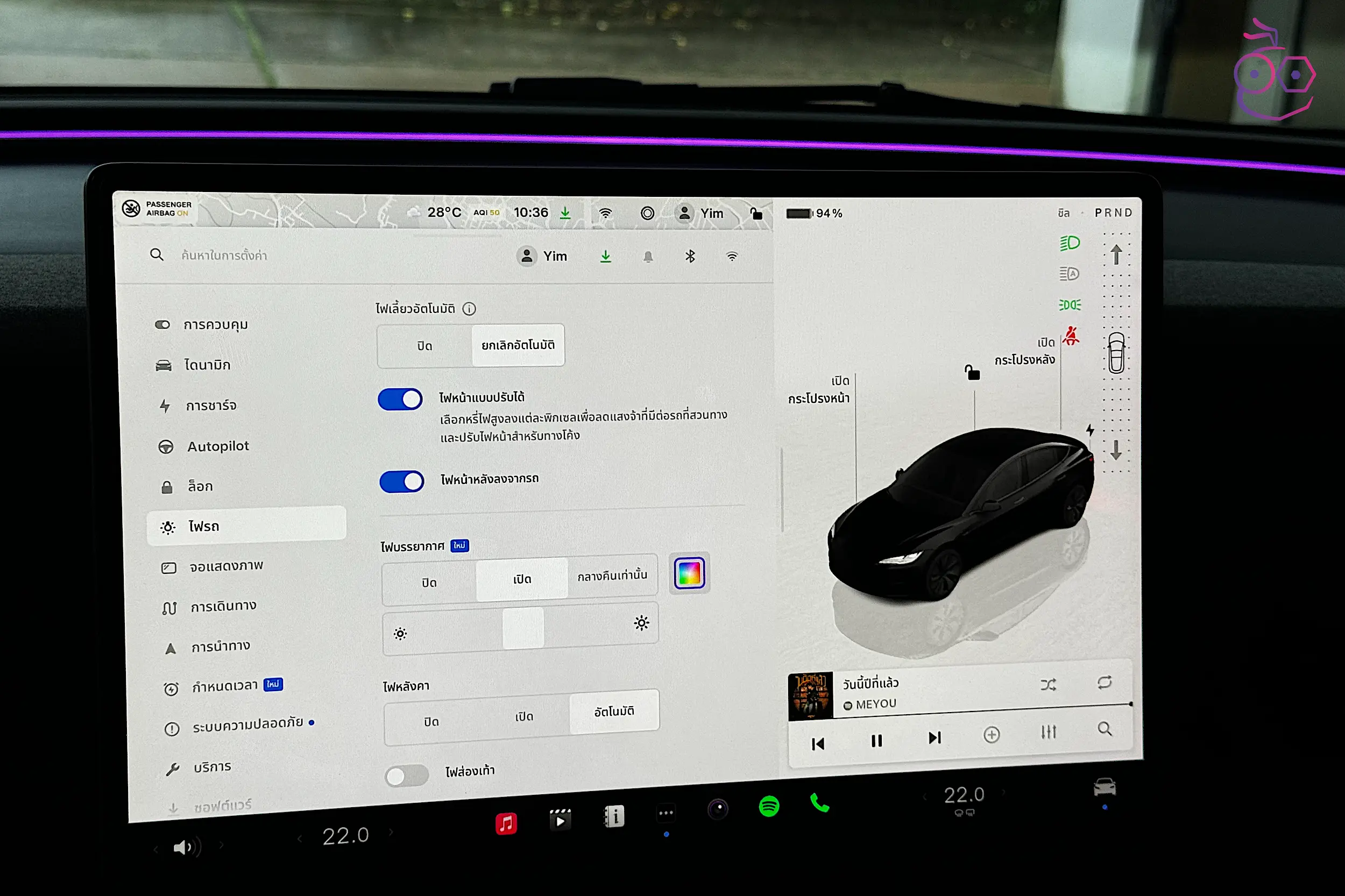 การตั้งค่าไฟ Ambient Light รอบห้องโดยสาร มีตัวเลือก กลางคืนเท่านั้น ถ้าหากเราต้องการให้เปิดไฟเมื่อแสงภายนอกมืดลง นอกจากนี้ยังสามารถลดหรือเพิ่มความสว่างได้