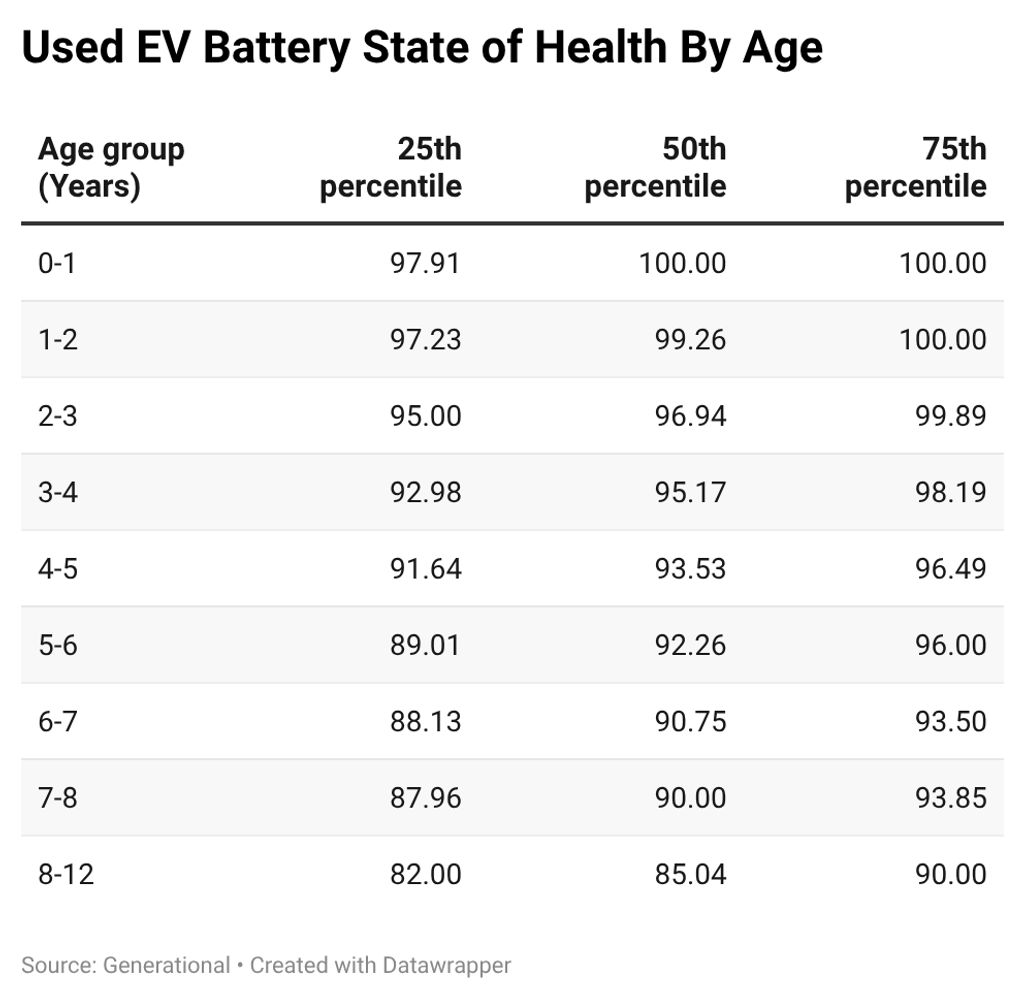 Generational บริษัทจากอังกฤษที่เชี่ยวชาญด้านการประเมินสุขภาพแบตเตอรี่ EV ได้เก็บข้อมูลจากรถกว่า 8,000 คันในปี 2025 พบว่ารถส่วนใหญ่ยังมีแบตเตอรี่ที่แข็งแรงและมีความจุใกล้เคียงกับของใหม่ ทางบริษัทระบุในรายงานว่า “การเสื่อมสภาพของแบตเตอรี่ไม่ใช่ความเสี่ยงในระดับระบบอย่างที่เคยกลัวกัน