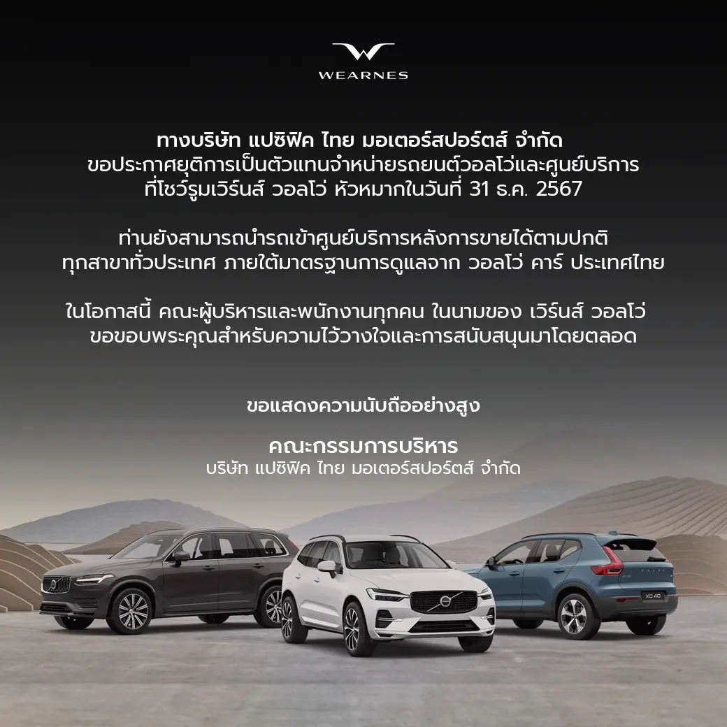 Wearnes Volvo ประกาศยุติการเป็นตัวแทนผู้จำหน่ายรถยนต์ Volvo อย่างเป็นทางการ ในวันที่ 31 ธันวาคม 2567