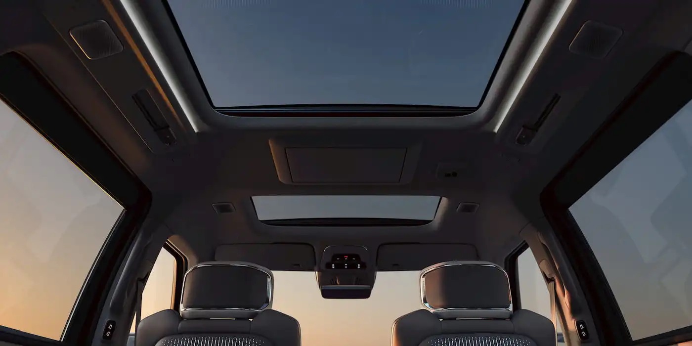 Volvo EM90 มาพร้อมหลังคาซันรูปแบบพาโนรามาที่ครอบคลุมทั่วห้องโดยสาร พร้อมกับมีม่านที่สามารถตั้งค่าแสงโดยรอบให้เหมาะกับการใช้งานได้