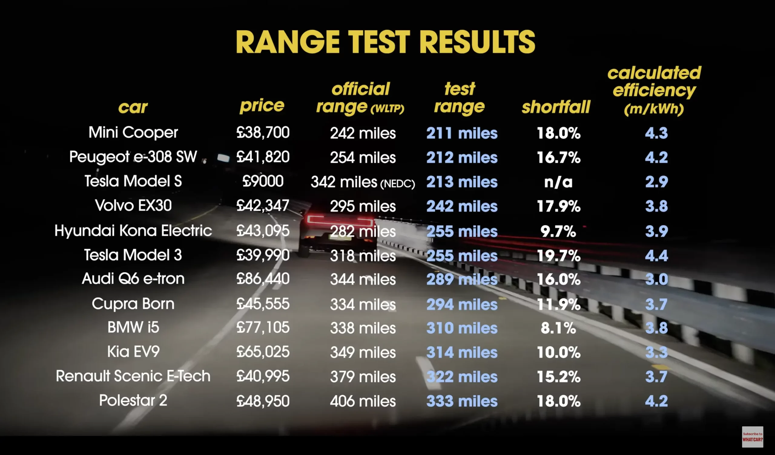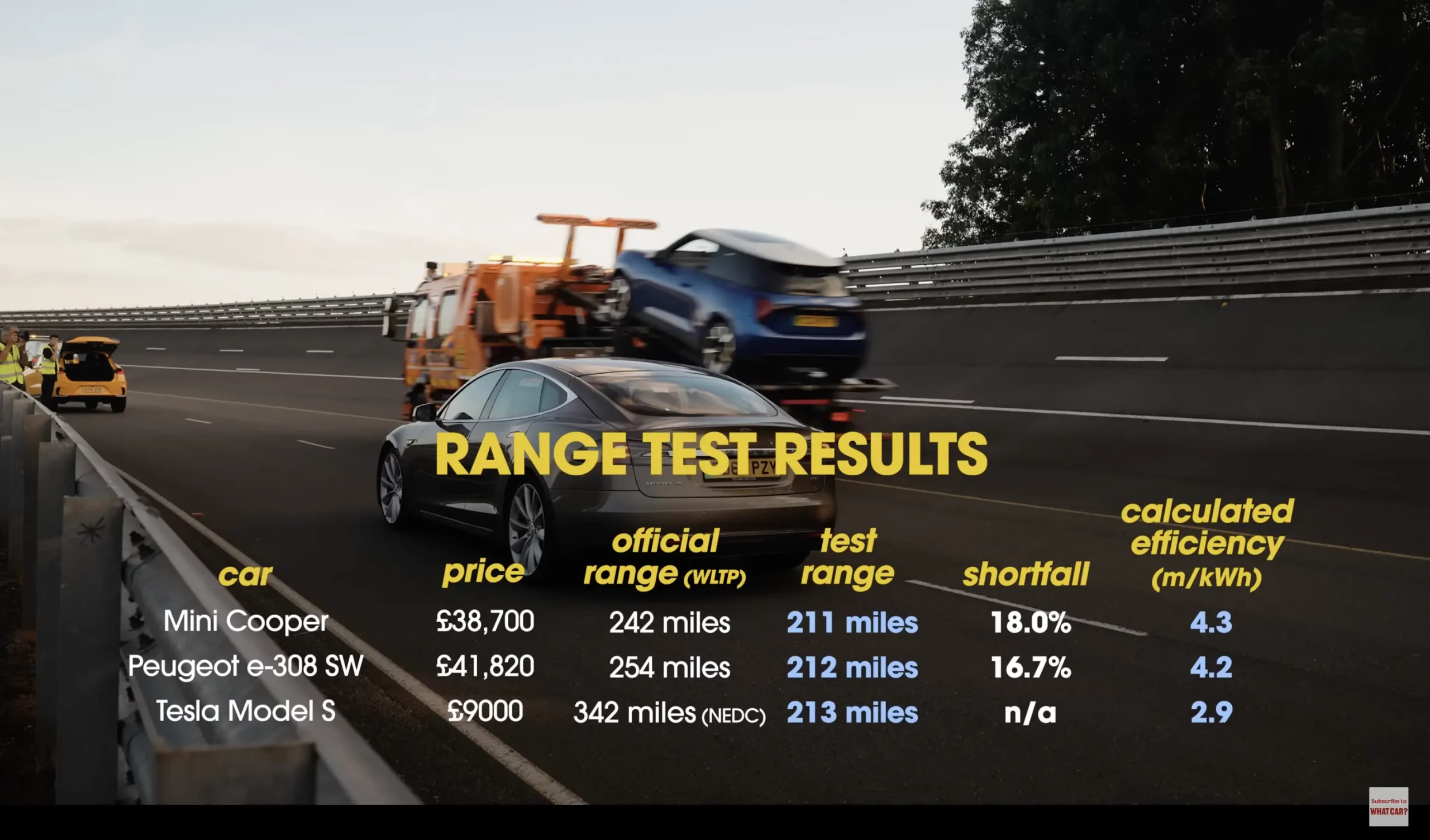 ในการทดสอบของ What Car? ได้ใช้รถยนต์ Tesla Model 3 Rear Wheel Drive (RWD) และรถยนต์อีก 11 รุ่นหลากหลายช่วงราคา โดยมี Tesla Model S ที่มีอายุถึง 9 ปี ไมล์มากกว่า 250,000 ร่วมทดสอบด้วย