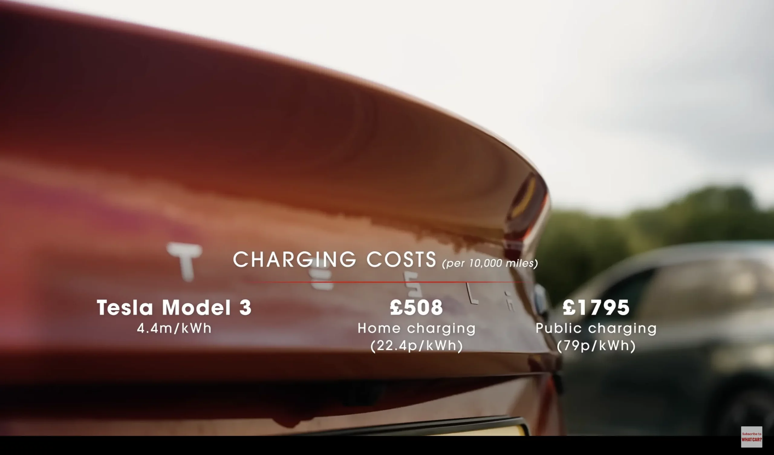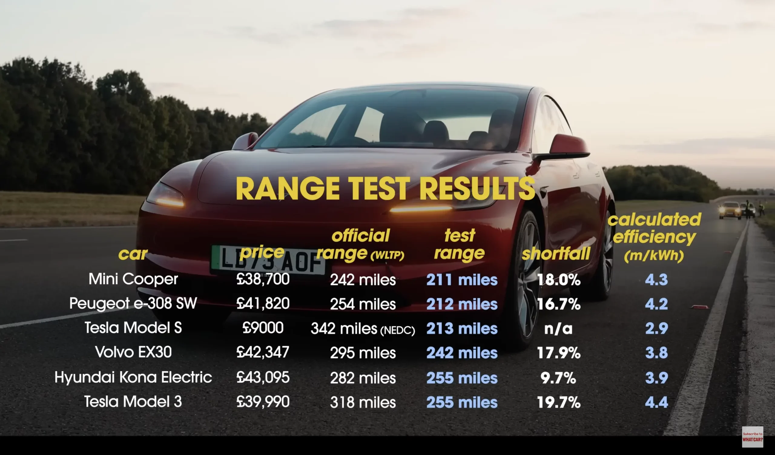 จากผลการทดสอบระยะทางของ What Car? พิสูจน์ได้ว่า Tesla Model 3 RWD เป็นรถยนต์ไฟฟ้าที่มีประสิทธิภาพสูงสุดในบรรดารถยนต์ไฟฟ้าที่นำมาทดสอบ ถึงแม้ว่ารถจะวิ่งระยะทางได้ 255 ไมล์ (410 กม.) แต่อัตราการบริโภคพลังงานเฉลี่ยถึง 4.4 ไมล์/กิโลวัตต์ชั่วโมง (7 กิโลเมตร/กิโลวัตต์ชั่วโมง )