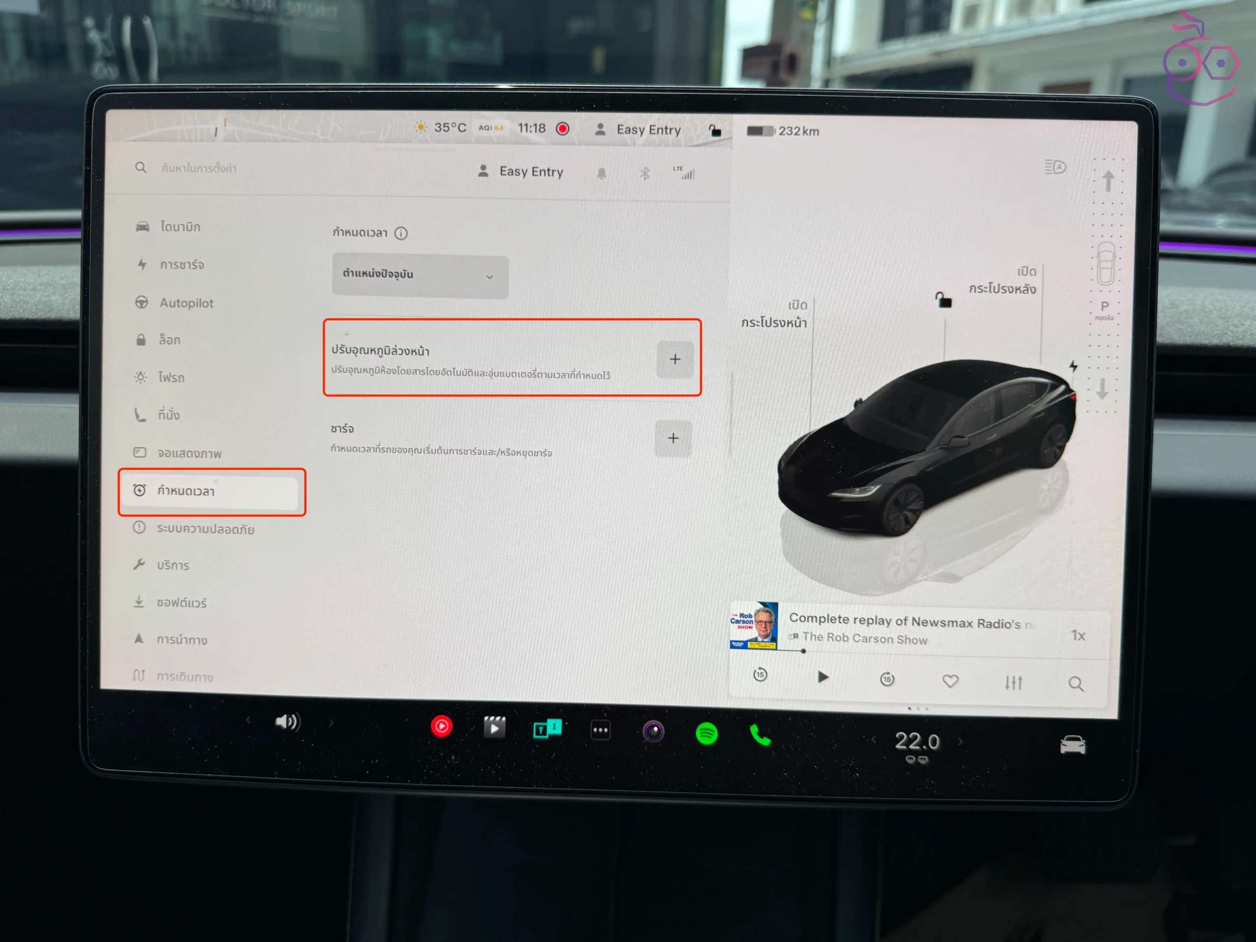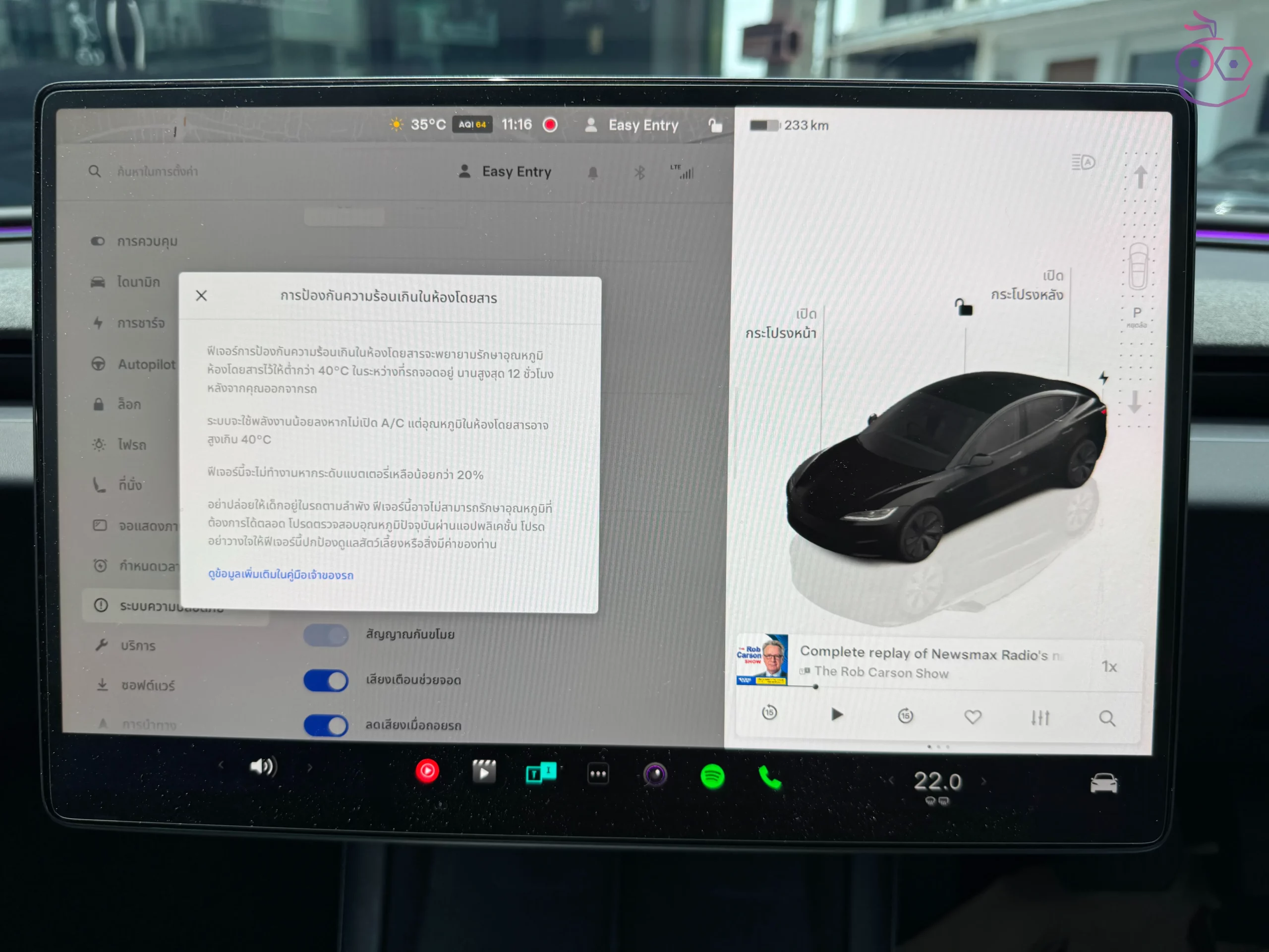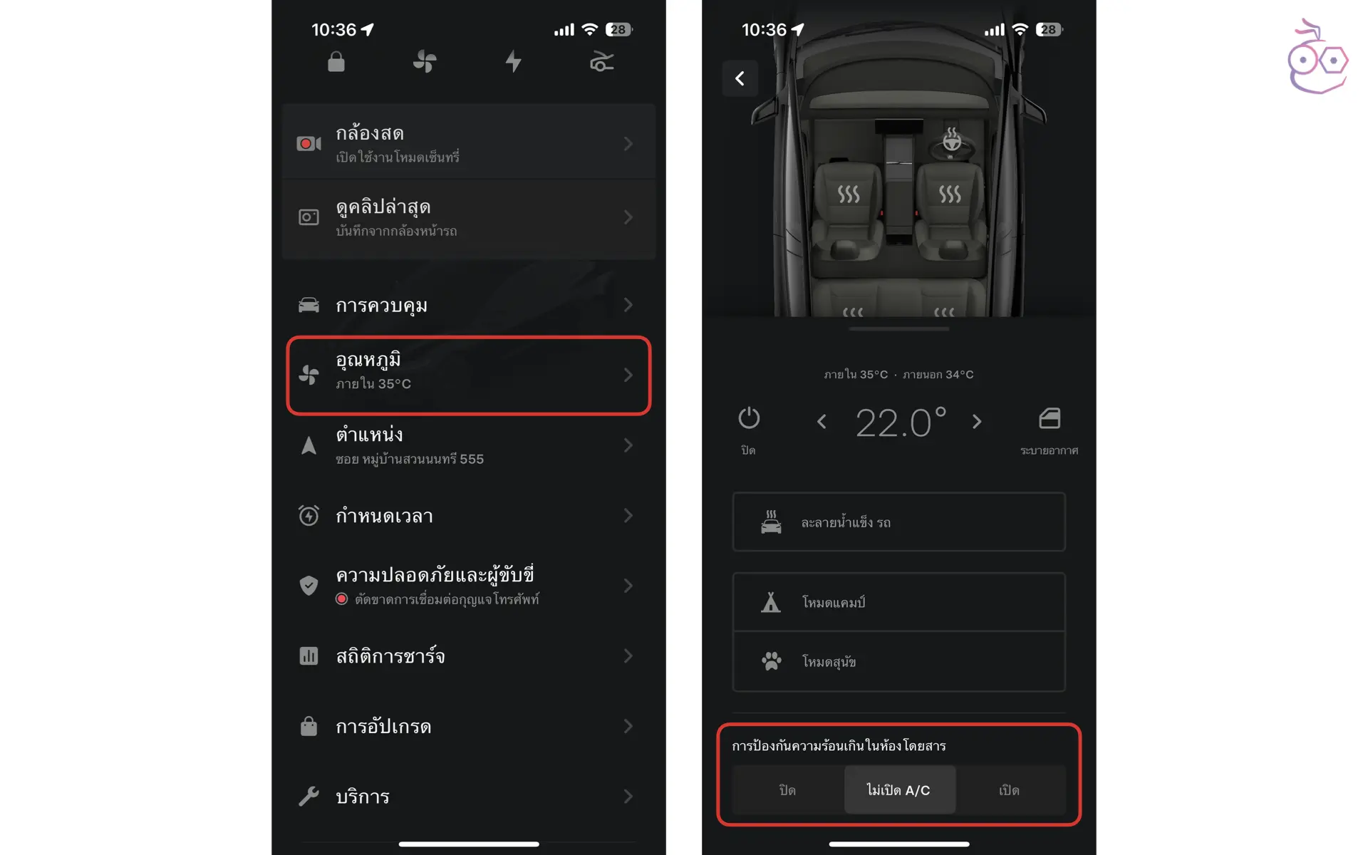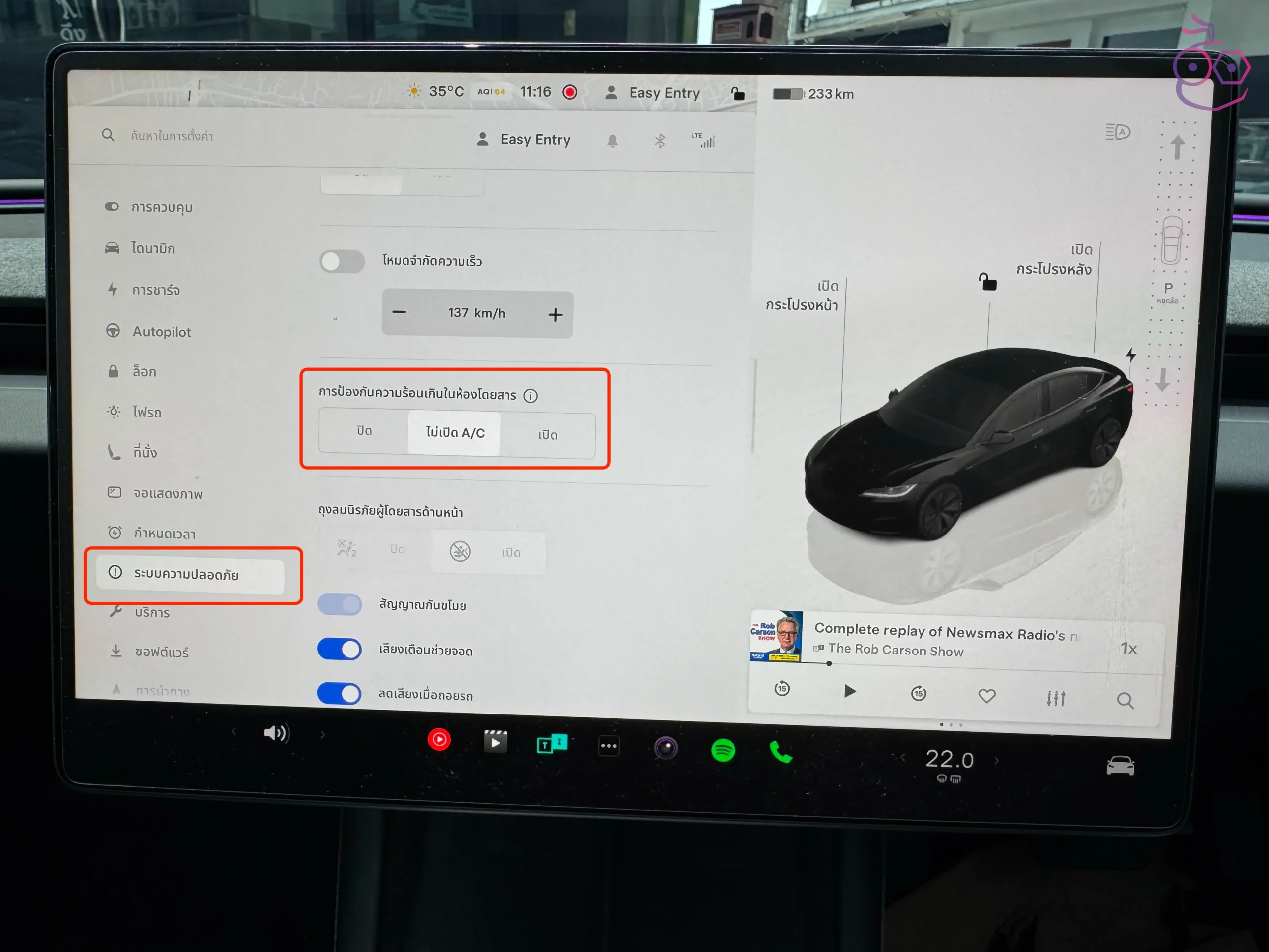 สามารถตั้งค่าได้ที่ ควบคุม (Controls) > ความปลอดภัย (Safety) > ป้องกันความร้อนเกินในห้องโดยสาร (Cabin Overheat Protection) ซึ่งระบบนี้มี 3 ตัวเลือก ได้แก่ Off, No A/C, และ On
